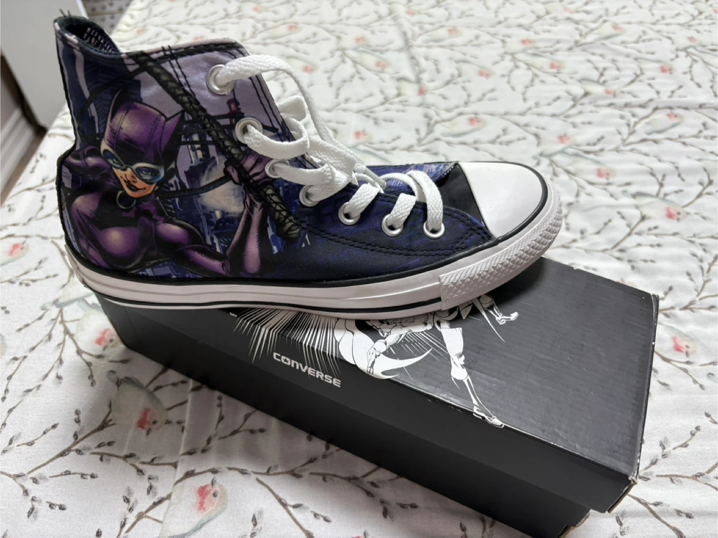 93Selling a pair of Converse Chuck Taylor All Star high tops featuring a DC Comics Catwoman design! They're in great shape and come with the original box. - Brand: Converse - Model: Chuck Taylor All Star - Design: DC Comics Catwoman - Size: Men's 5 / Women's 7 (US)