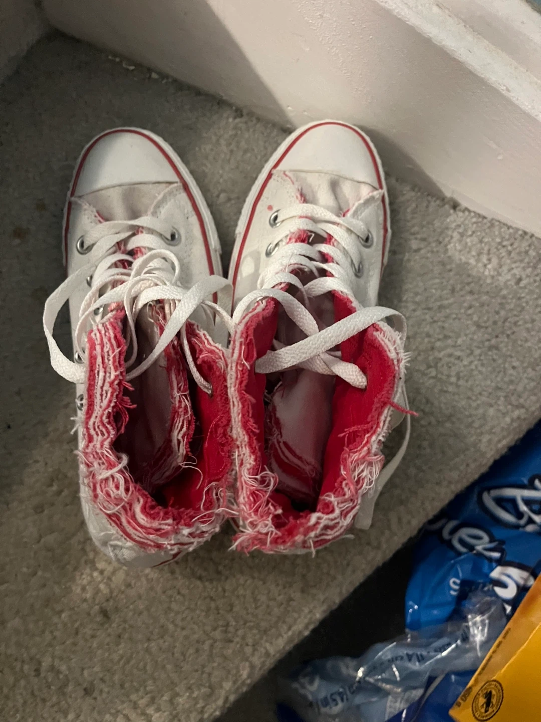 91Selling a pair of Converse Chuck Taylor All Star high top sneakers! They are white with red accents and laces. These shoes have been worn but still have lots of life left in them