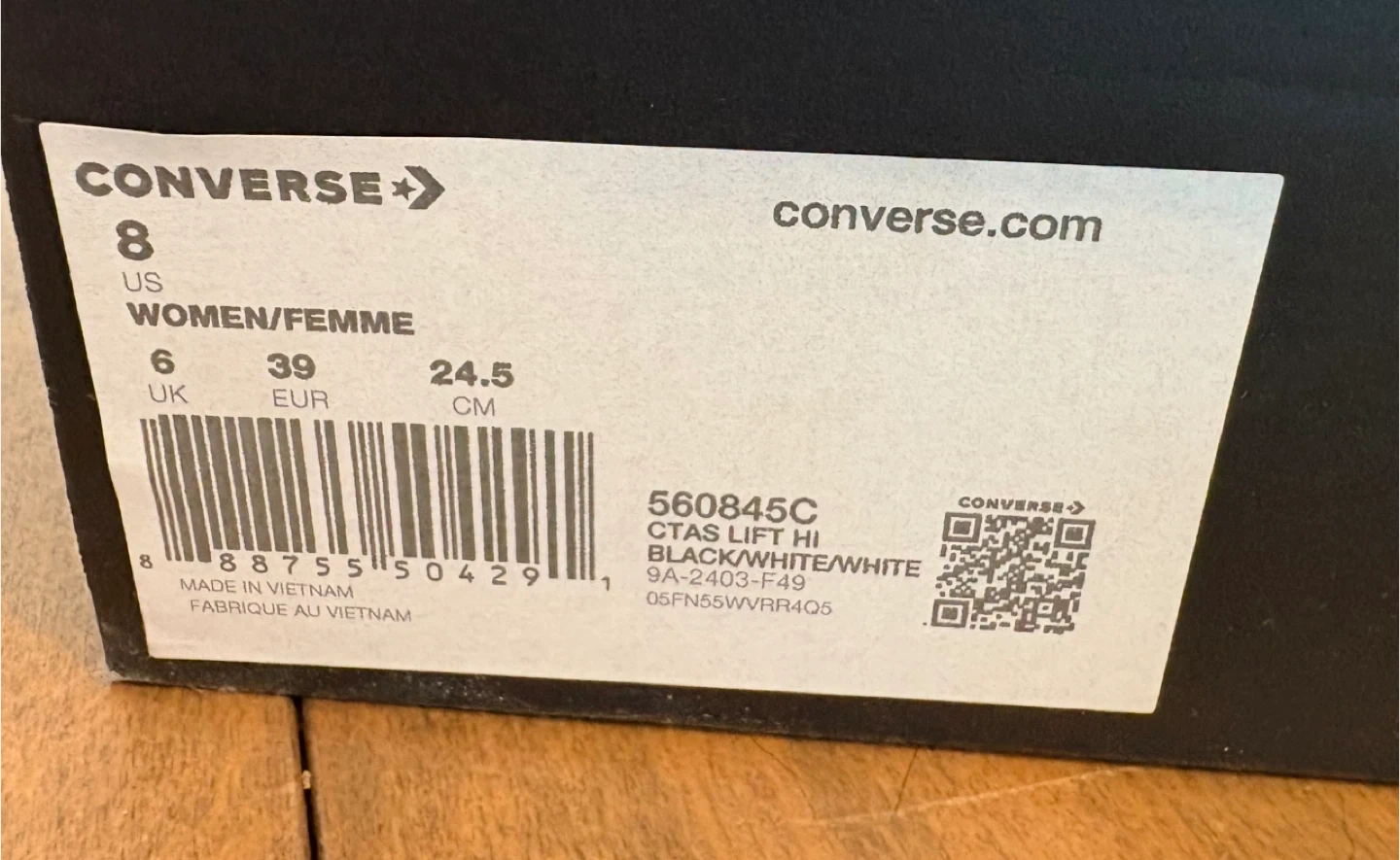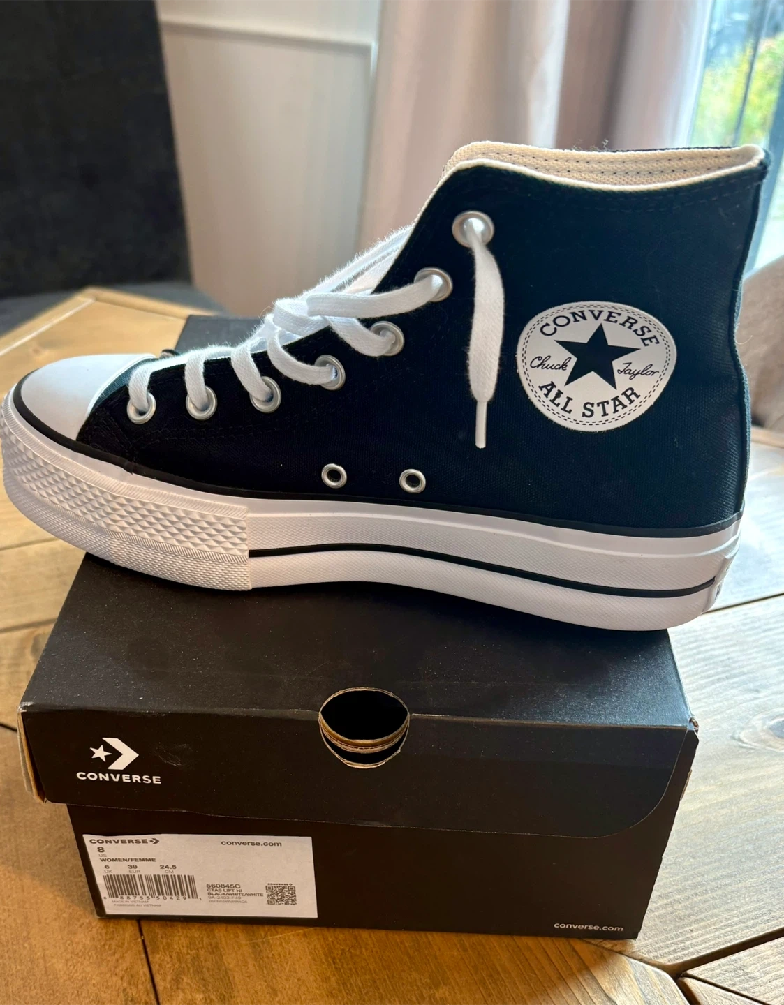 10Selling a pair of Converse Chuck Taylor All Star Lift Hightop sneakers in women's US size 8! They are black and white and never worn. Comes with the original box.
