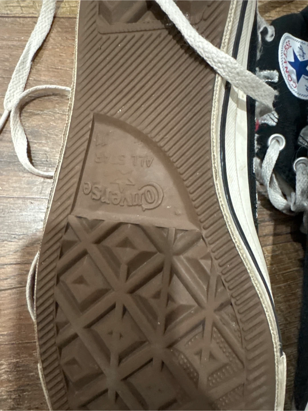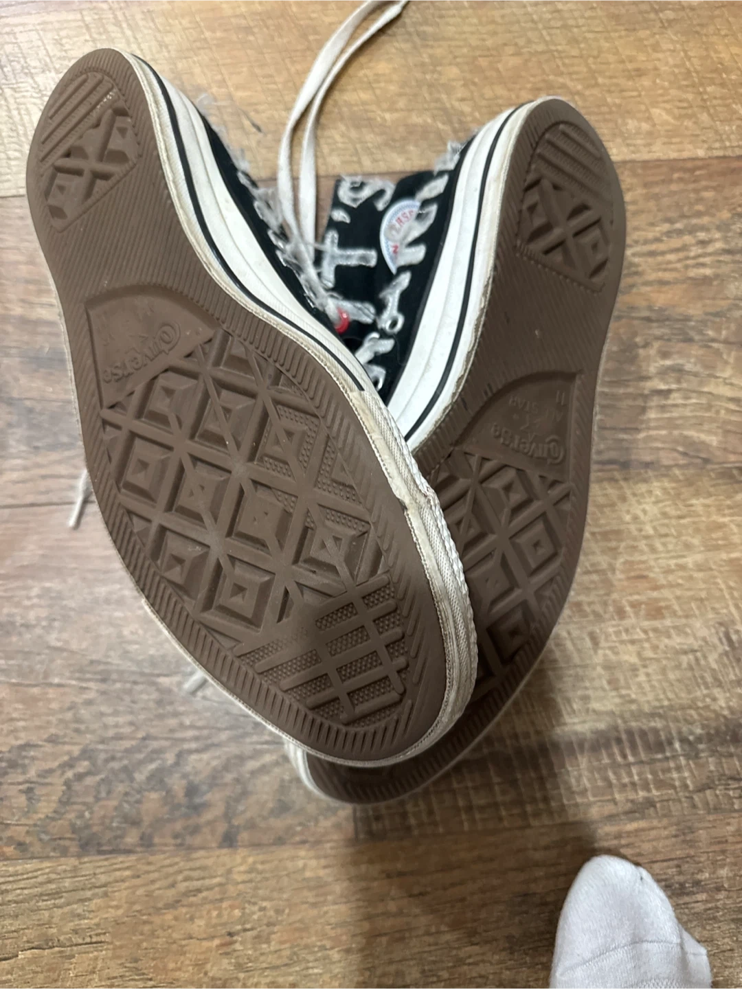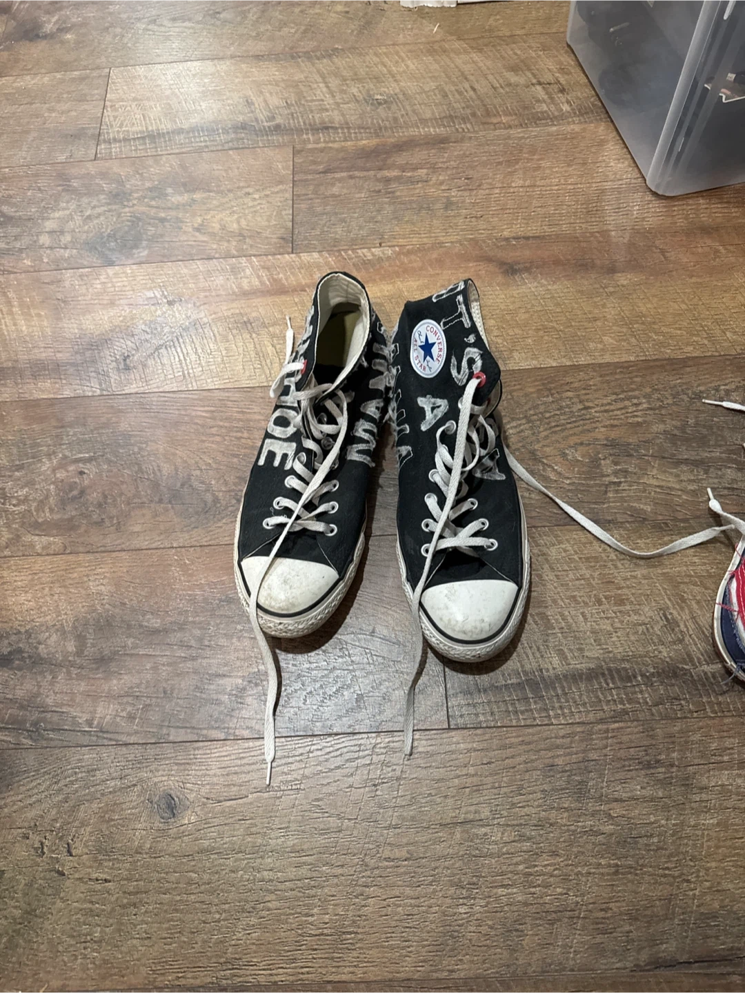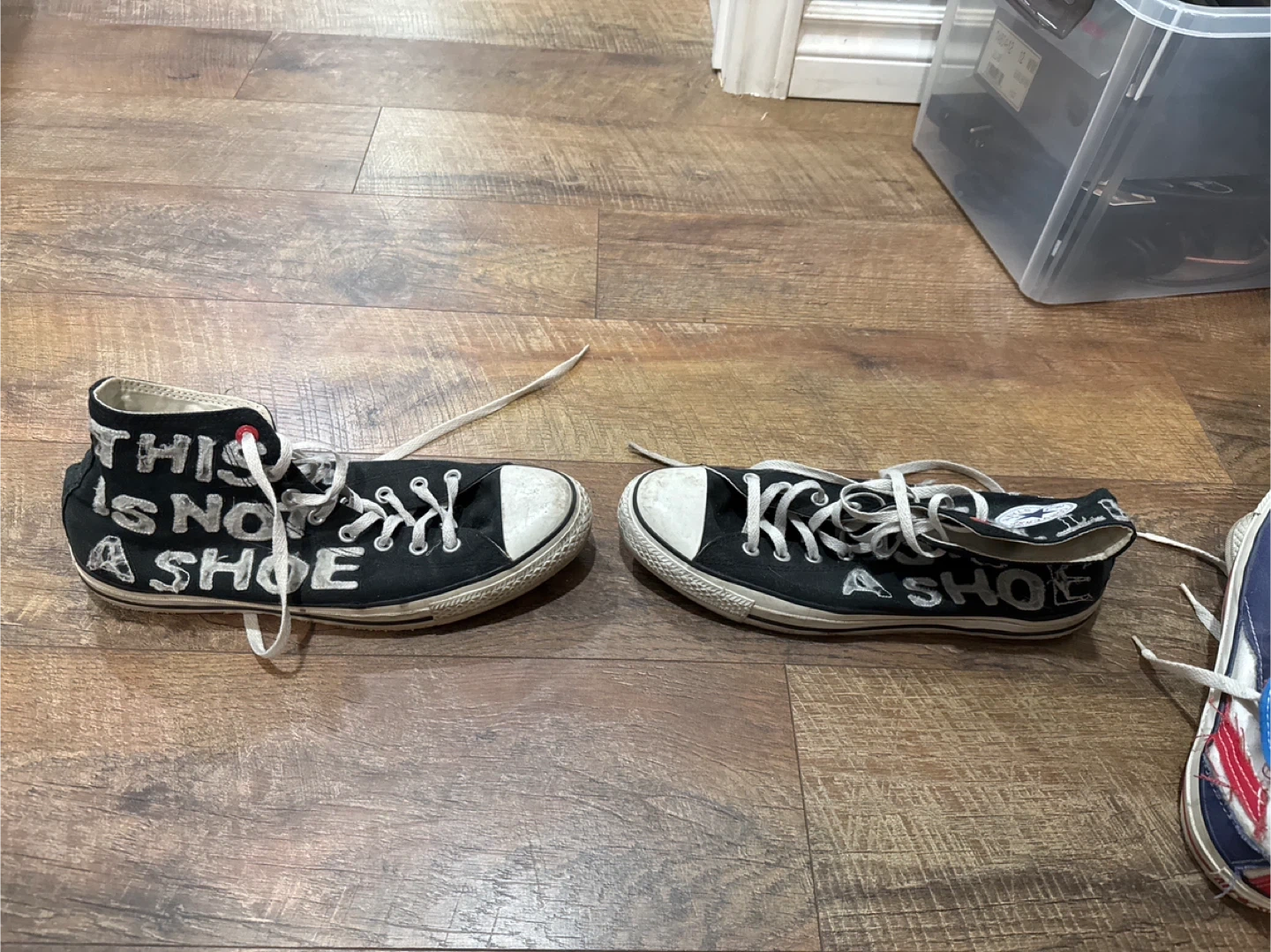 Selling a pair of Converse high tops circa 2005! They are black and white and say 'This is not a shoe it’s a mania' on the sides. They are in used condition, but still have lots of life left in them. Size 11