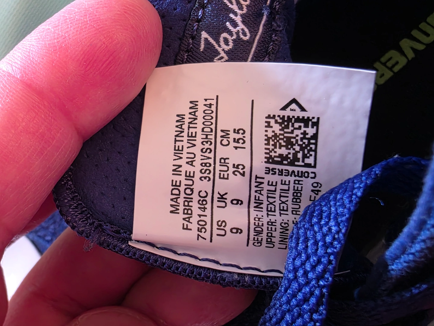 Pair of navy blue Converse infant high-top sneakers. Size US 9, EUR 25. Made in Vietnam. Canvas upper, textile lining, rubber sole. Pre-owned.