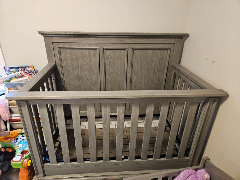 60Selling a 4 in 1 Kendra crib by Oxford baby in a lovely grey colour. This 4 in1 Crib converts to a toddler bed, day bed and full size bed. Full bed conversion kit and toddler guard rails are sold separately.Green Guard Gold Certified, Kendra crib is tested for Health Canada and CPSC regulations and comes in hand rubbed wire brushed Gray finish. Assembled Dimensions: 58.75" W x 31.50" D x 49.00" H It's in great condition and ready for a new home. Perfect for your little one's nursery!
