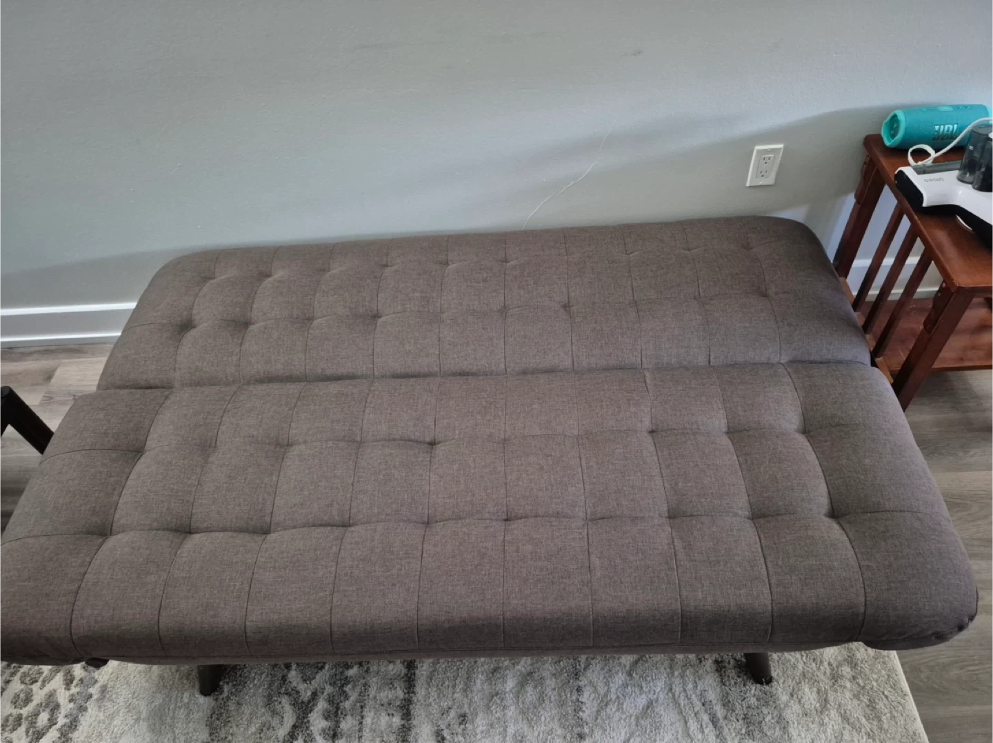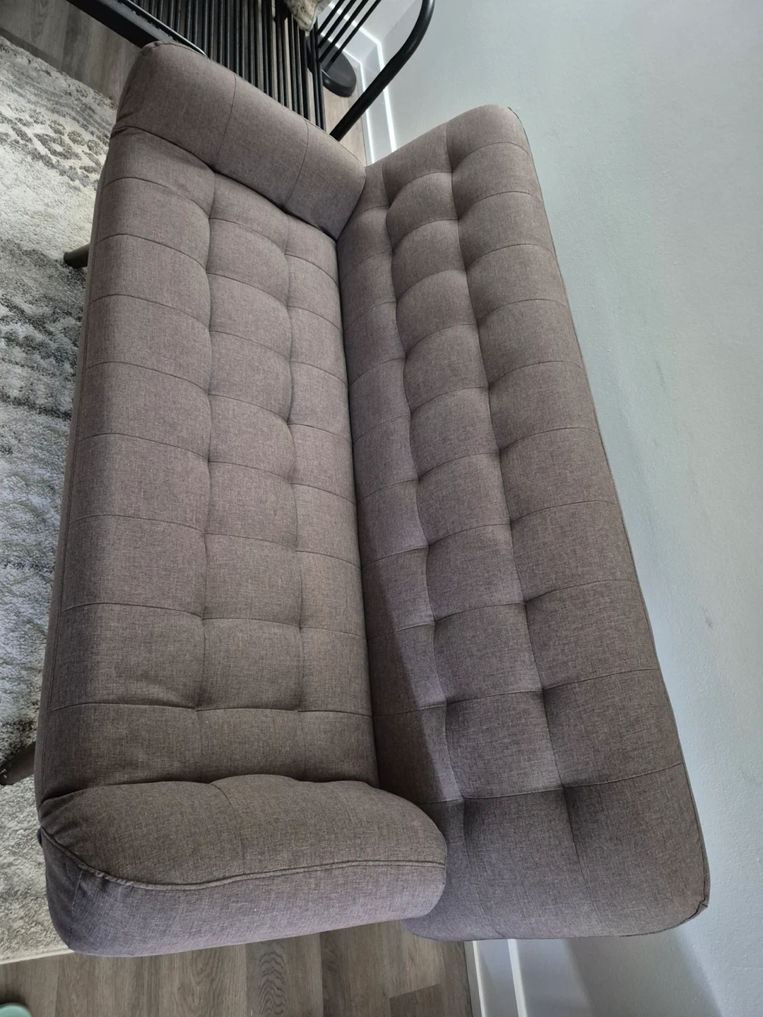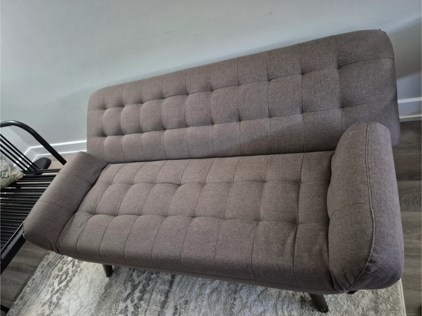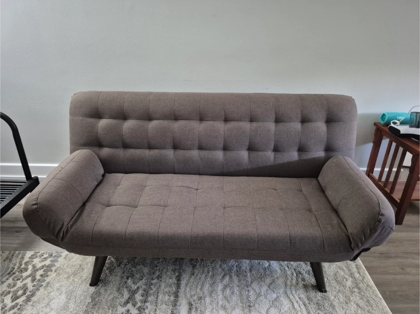 Selling a convertible futon sofa bed in a neutral grey colour. It's in great shape and can be used as a sofa or easily converted into a bed. Perfect for small spaces or guest rooms!