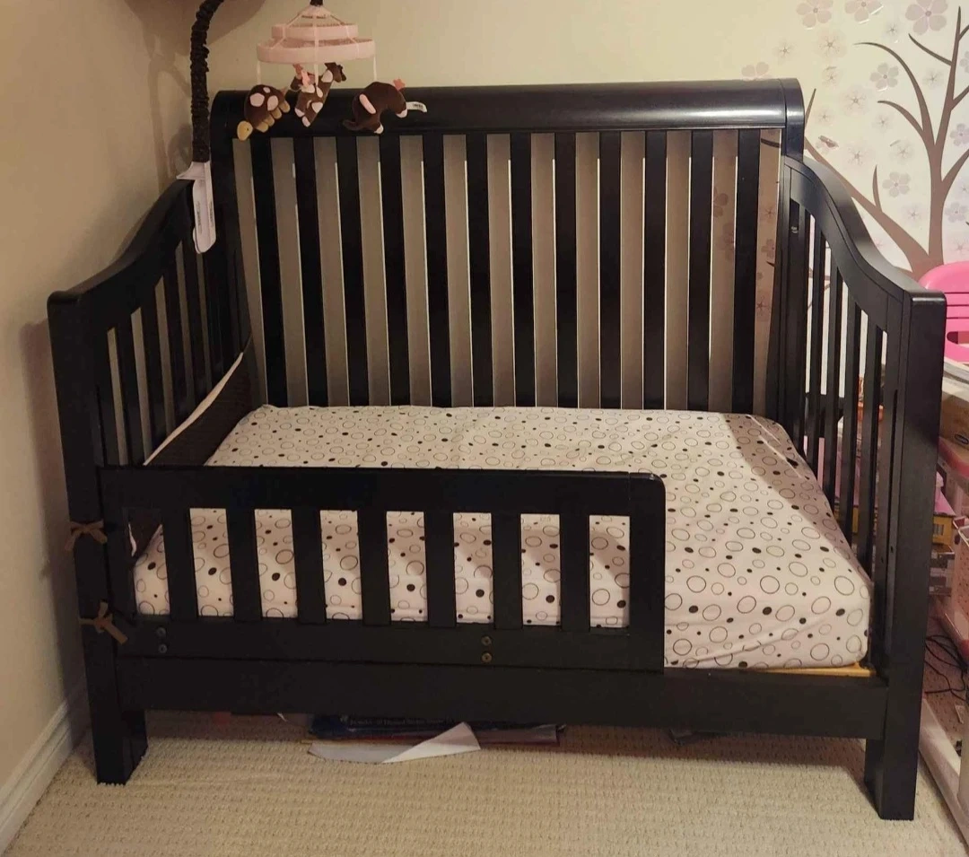 104 in 1 crib - crib, toddler bed, Day bed, full bed. Espresso colour, wood. Picture in listing is of toddler bed. Pm if interested. Does not include mattress. Pickup in Mississauga.