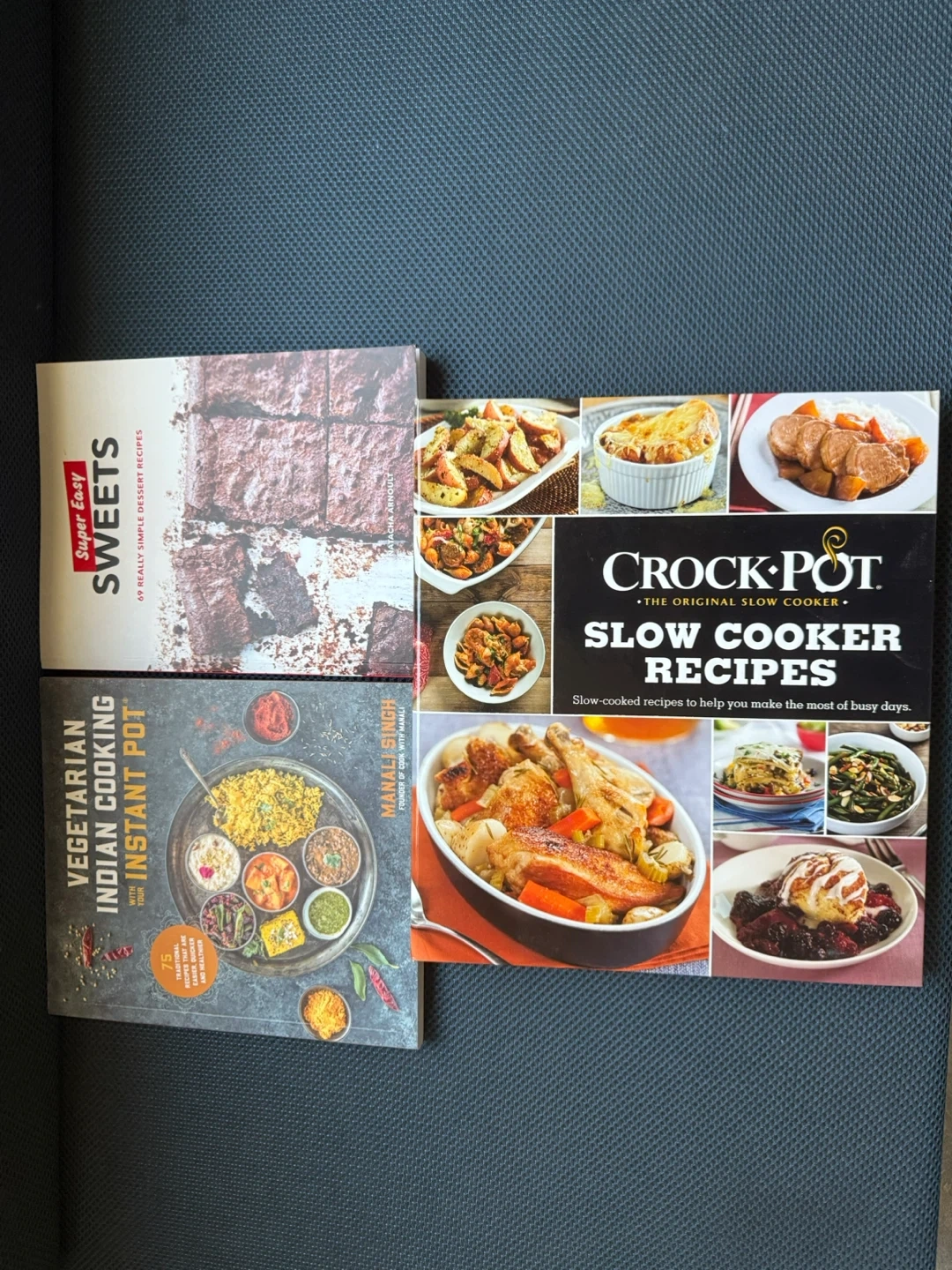 10Selling a set of three cookbooks! Included are: - Super Easy Sweets: 69 Really Simple Dessert Recipes by Hatacha Arnoult - Vegetarian Indian Cooking with your Instant Pot by Manali Singh - Crock-Pot Slow Cooker Recipes