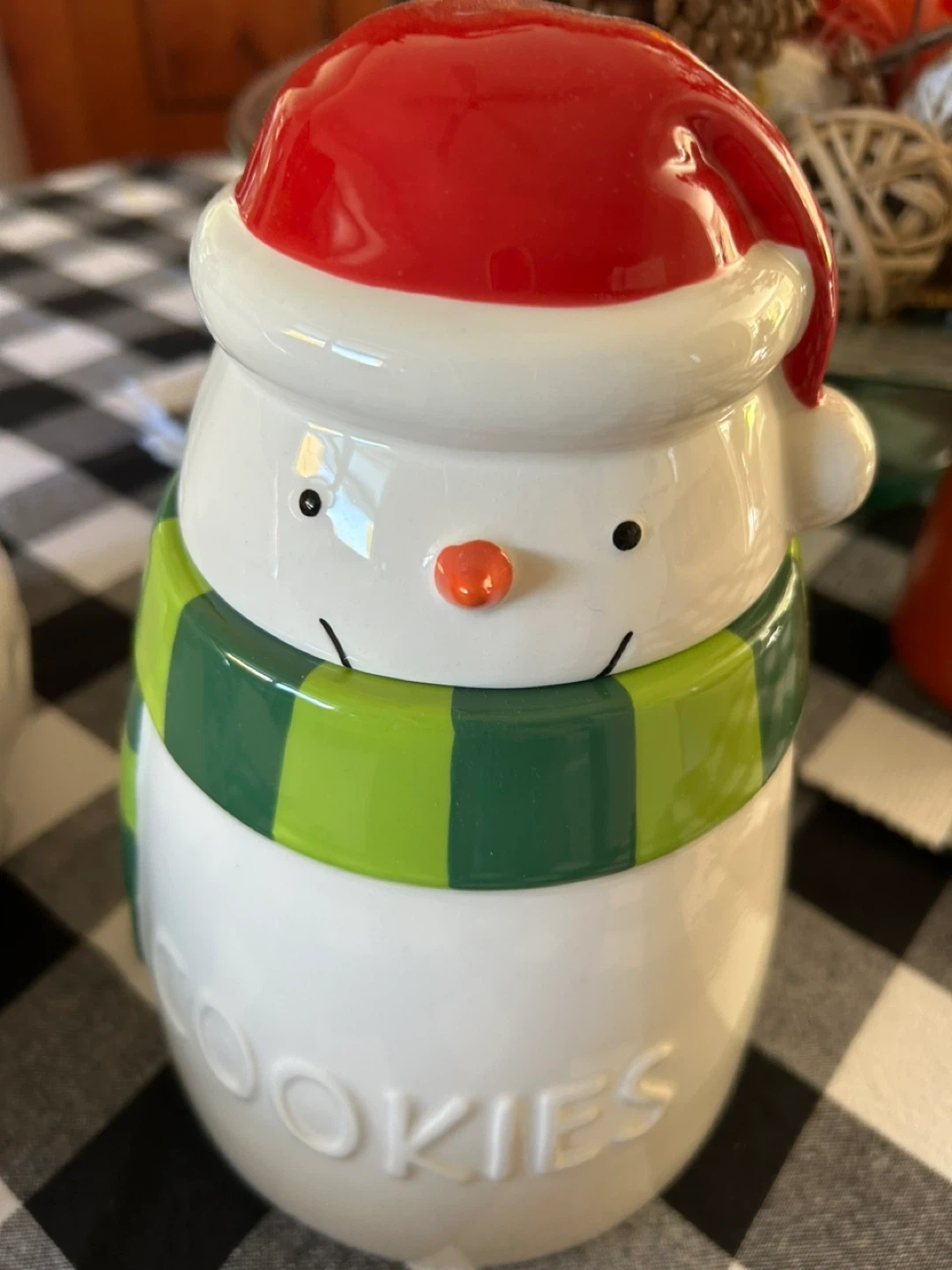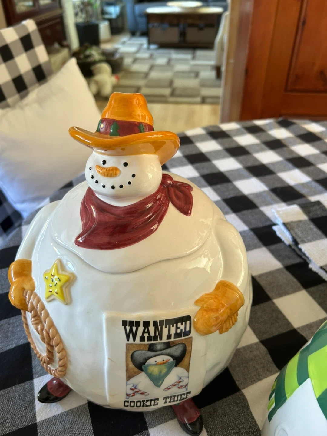 Here's a cute snowman cookie jar, perfect for adding a touch of winter charm to your kitchen! It's in great shape and ready to hold all your favourite treats. The sheriff will keep watch over the cookie stash. Selling together for 20$ They are free of chips. 1 large 1 small