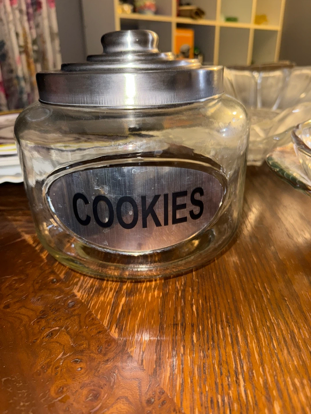 Selling a cookie jar with a silver lid! It's in great shape and perfect for storing your favourite treats. The jar has a clear glass body with the word "COOKIES" printed on the front in black letters. It would look great on any kitchen counter!
