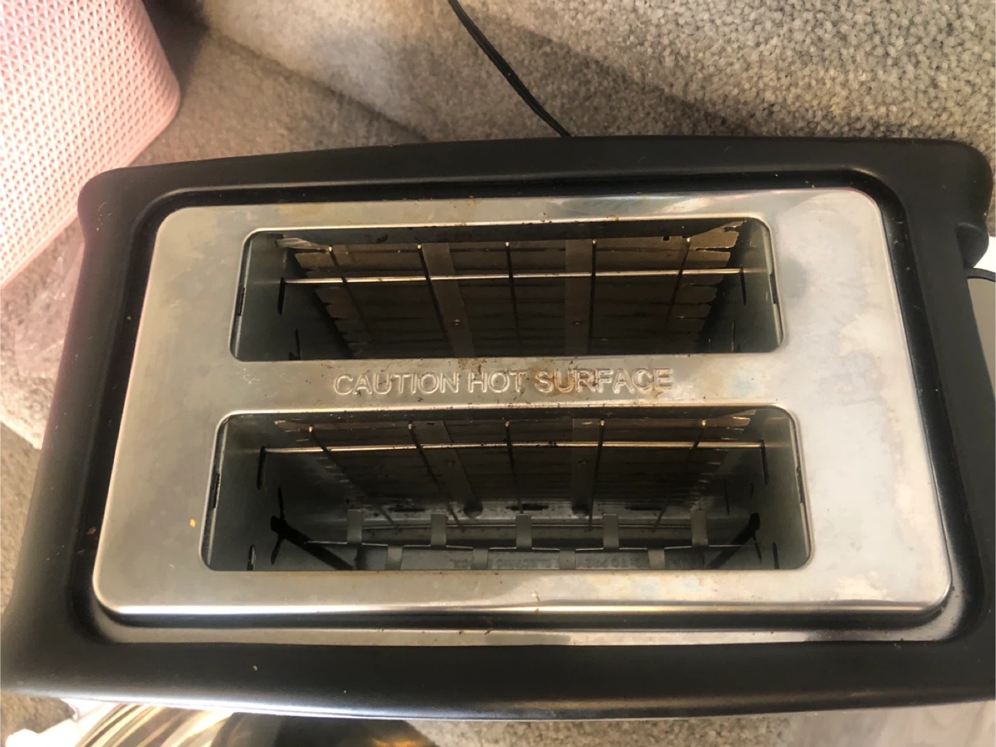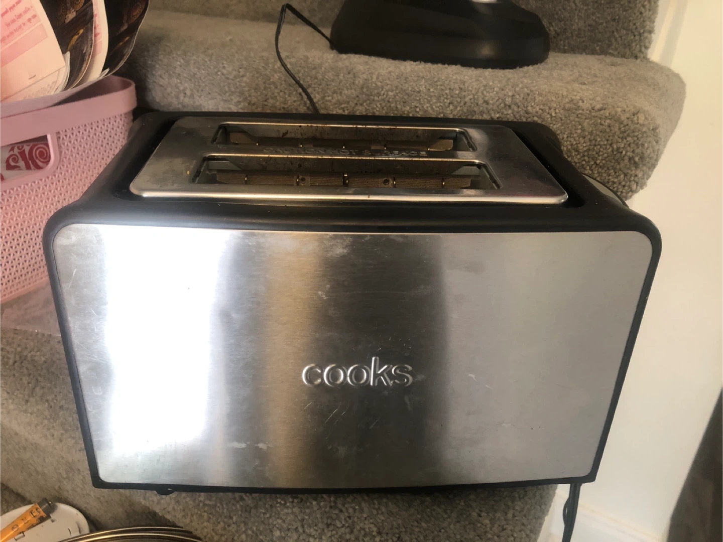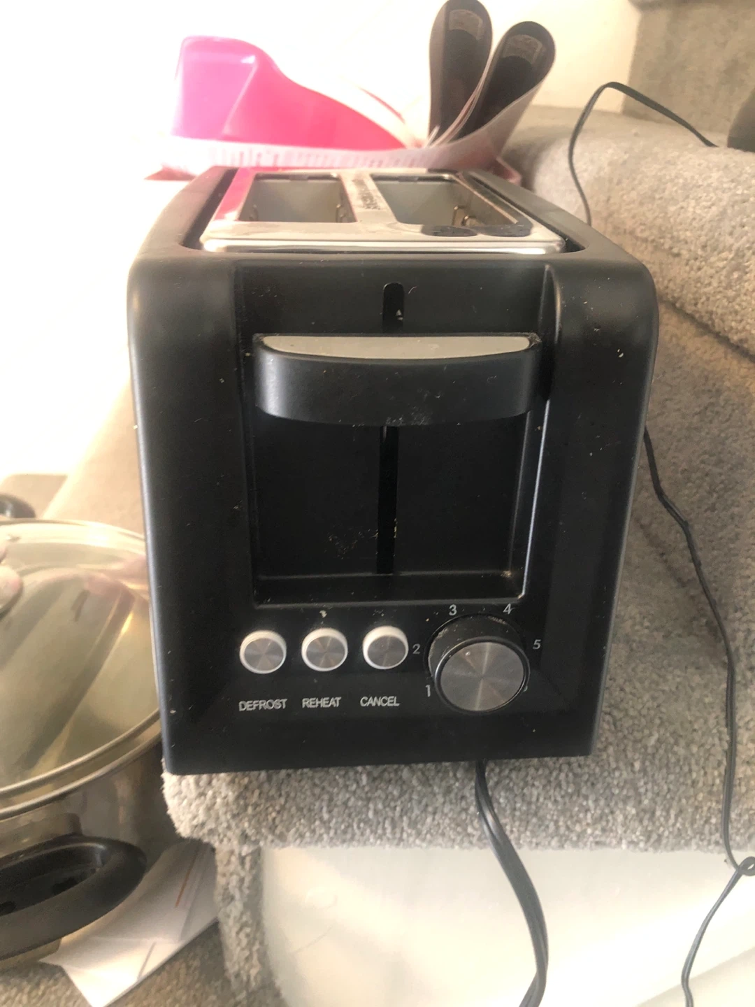 Selling a Cooks toaster in black and silver. It's a two-slice toaster with settings for defrost, reheat, and cancel. It's in good working condition and ready for a new home!