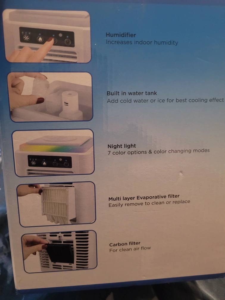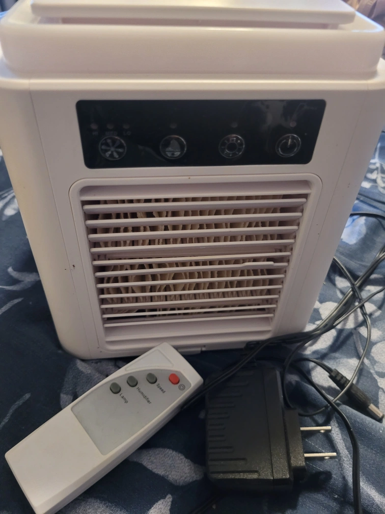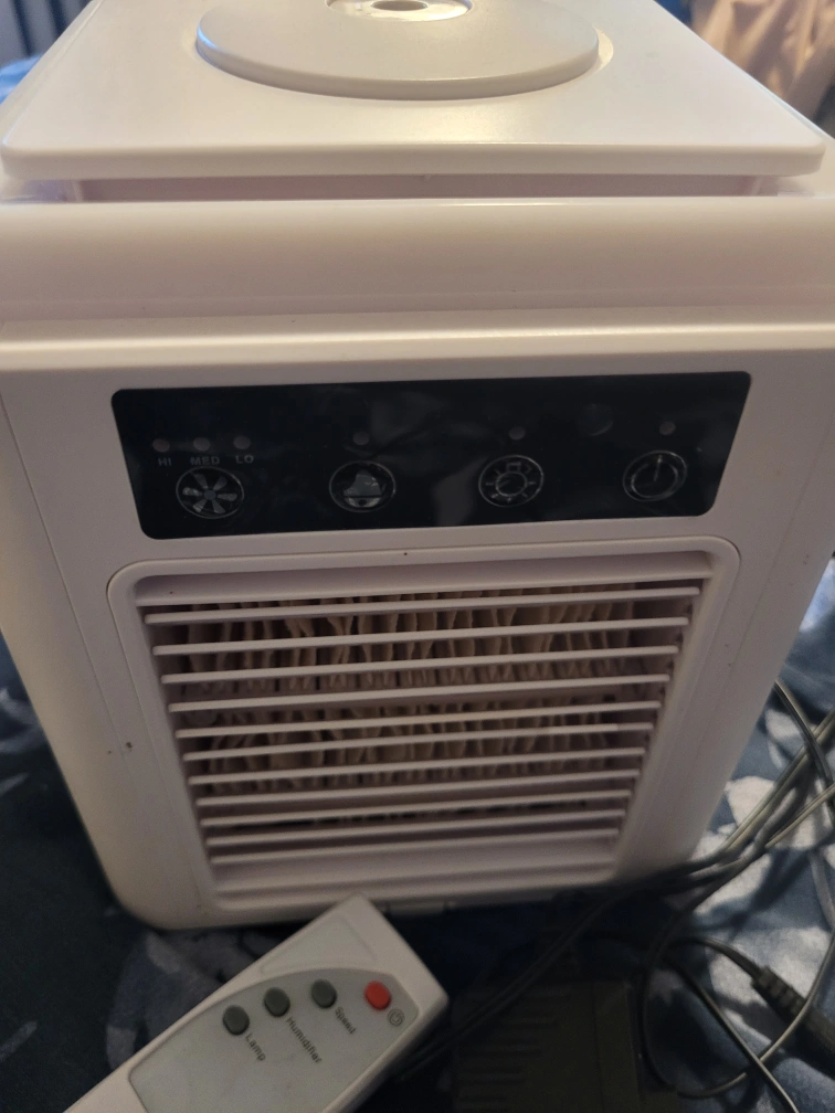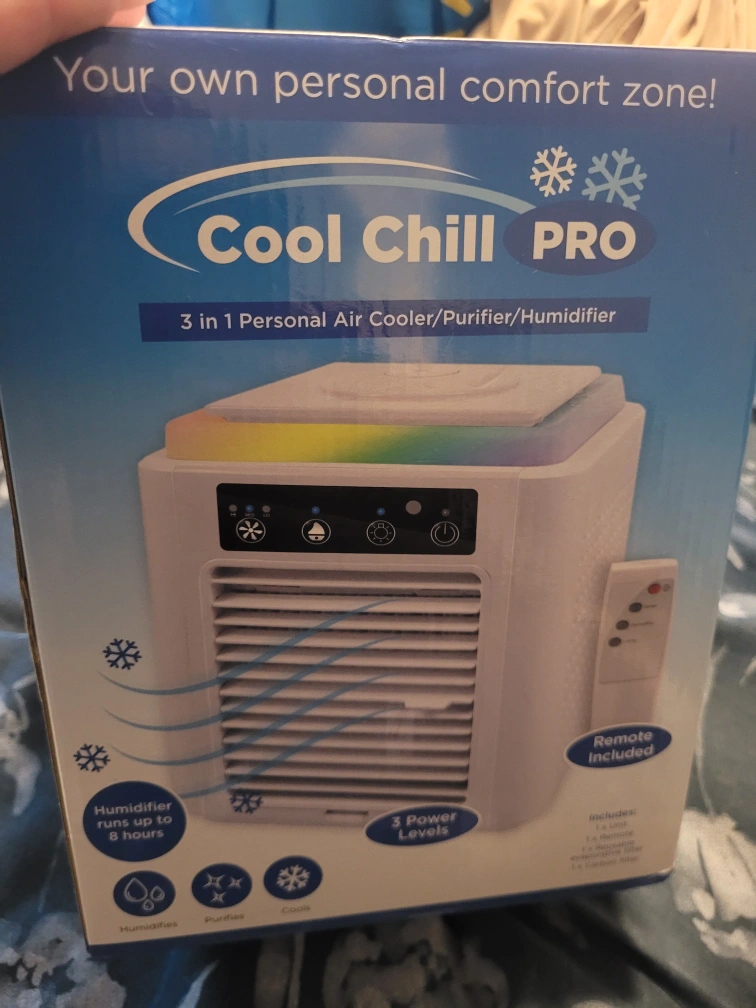 I'm selling a Cool Chill Pro 3-in-1 personal air cooler, purifier, and humidifier. It increases indoor humidity and has a built-in water tank. It also features: - Night light with 7 colour options and colour changing modes - Multi-layer evaporative filter that's easy to remove, clean, or replace - Carbon filter for clean air flow It comes with a remote and power adapter, too!