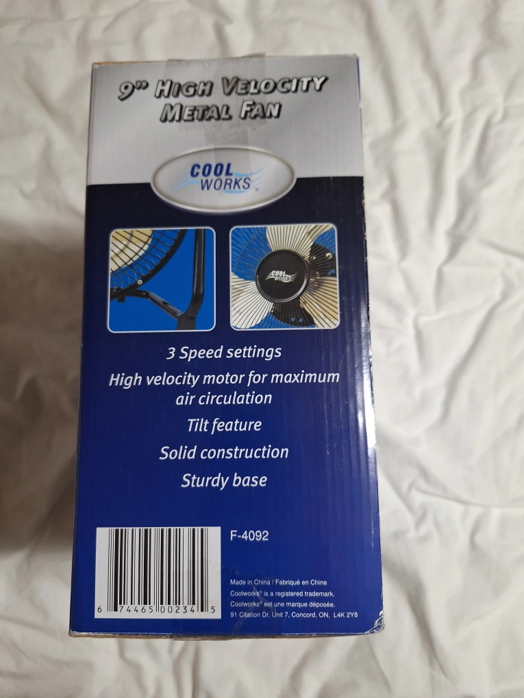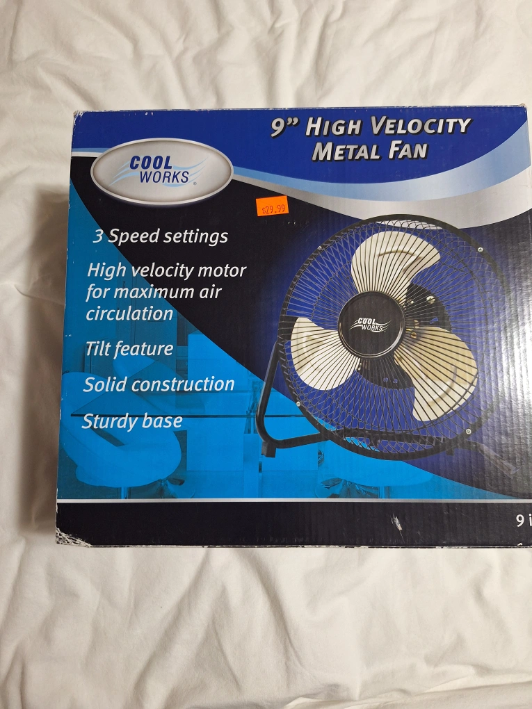 Selling a brand new Cool Works 9" High Velocity Metal Fan, still in its original box! It features: - 3 Speed settings - High velocity motor for maximum air circulation - Tilt feature - Solid construction - Sturdy base Originally priced at $29.99, this fan is ready to keep you cool