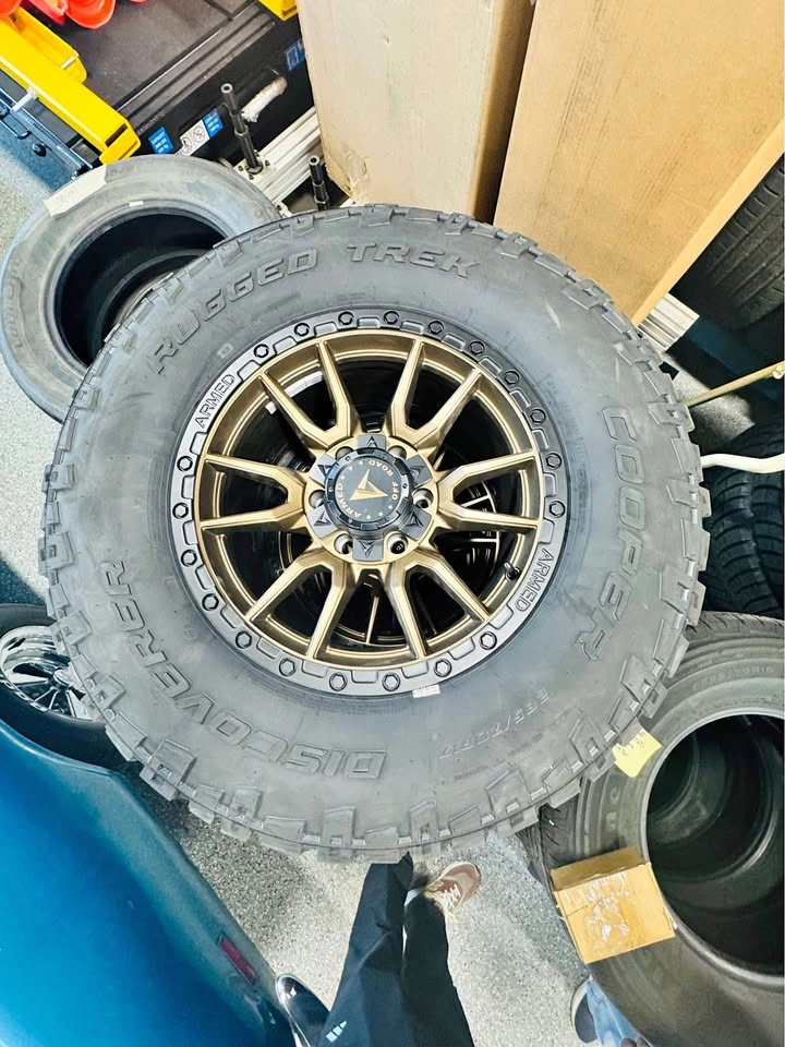 65Set of 4 Cooper Discoverer Rugged Trek all-terrain tires, size 285/70R17, mounted on Armed Off-Road Spear rims and complete with lug nuts. Perfect for trucks or SUVs — tough look, all-terrain performance, and winter-ready traction. Specs: • Tires: Cooper Discoverer Rugged Trek 285/70R17 • Rims: Armed Off-Road Spear (brand new) • Includes: Full set of lug nuts • Condition: 100% brand new (0 kms) • Ready to bolt on — no extra work needed