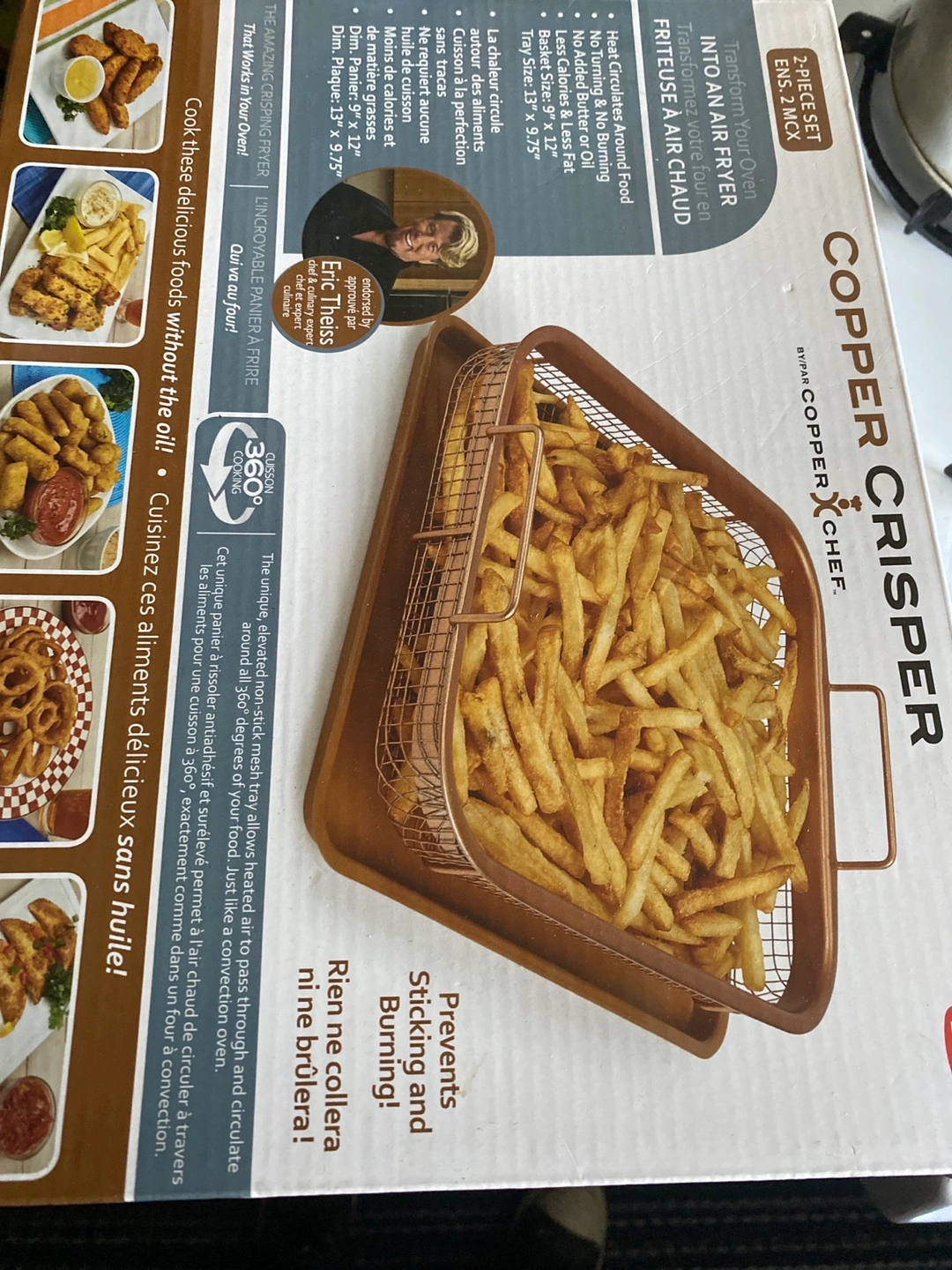 Get crispy food without the oil using the Copper Chef Crisper! This 2-piece set transforms your oven into an air fryer. The basket size is 9" x 12" and the tray size is 13" x 9.75". It prevents sticking and burning for perfect cooking every time… brand new, never used! Moving Sale Pick up only