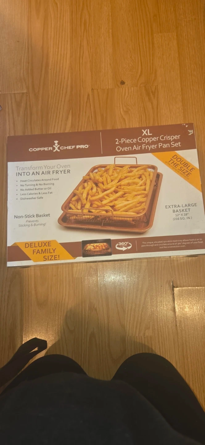 76Selling a Copper Chef Pro XL 2-Piece Oven Air Fryer Pan Set. It's designed to transform your oven into an air fryer! It features a non-stick basket to prevent sticking or burning. The extra-large basket measures 13" x 17" (216.5 sq. in).