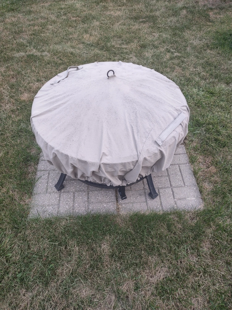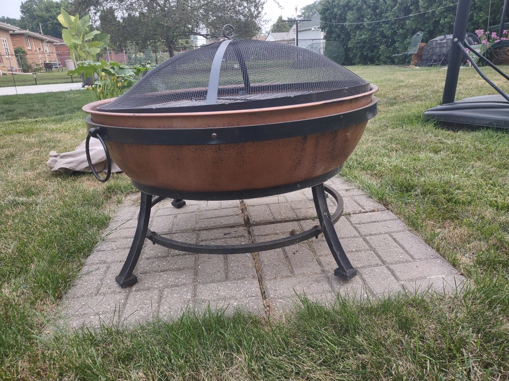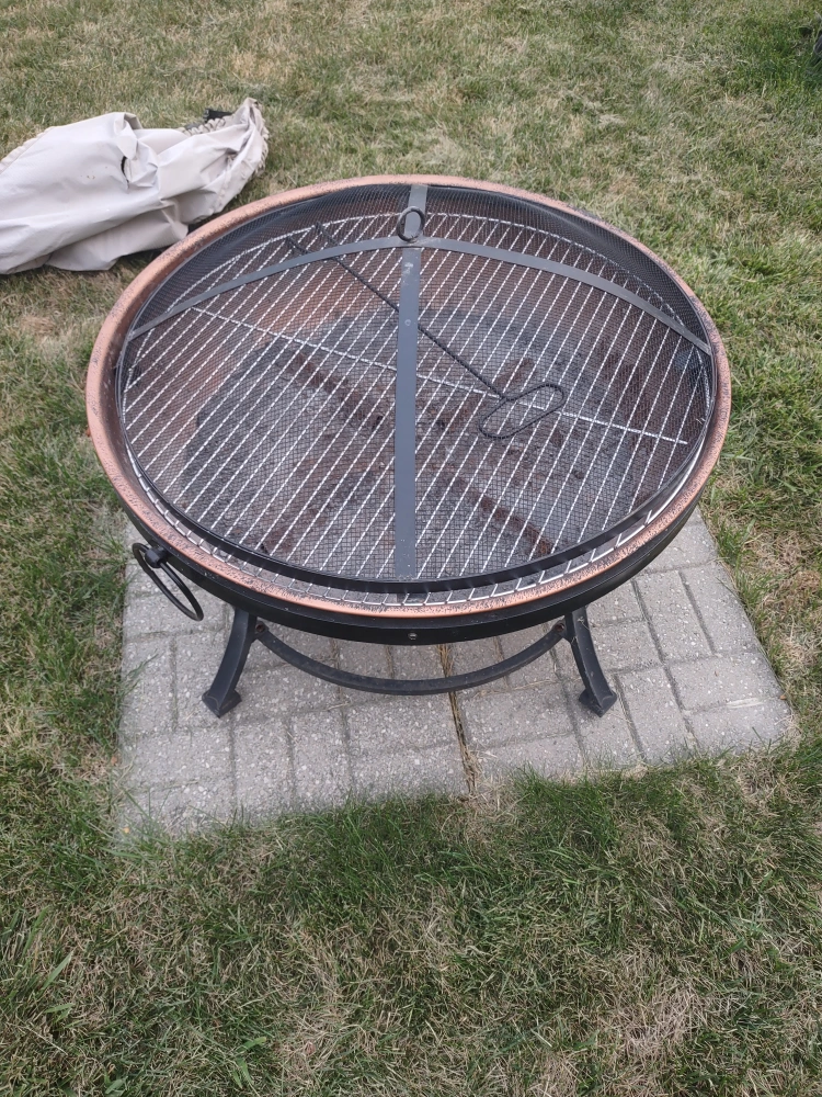 Selling a fire pit with a copper finish! It comes with a grill, mesh screen and a cover to keep it protected from the elements. Perfect for enjoying cozy evenings in the backyard.