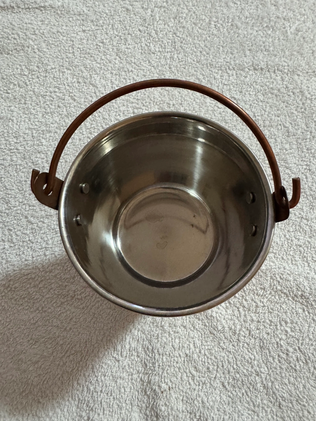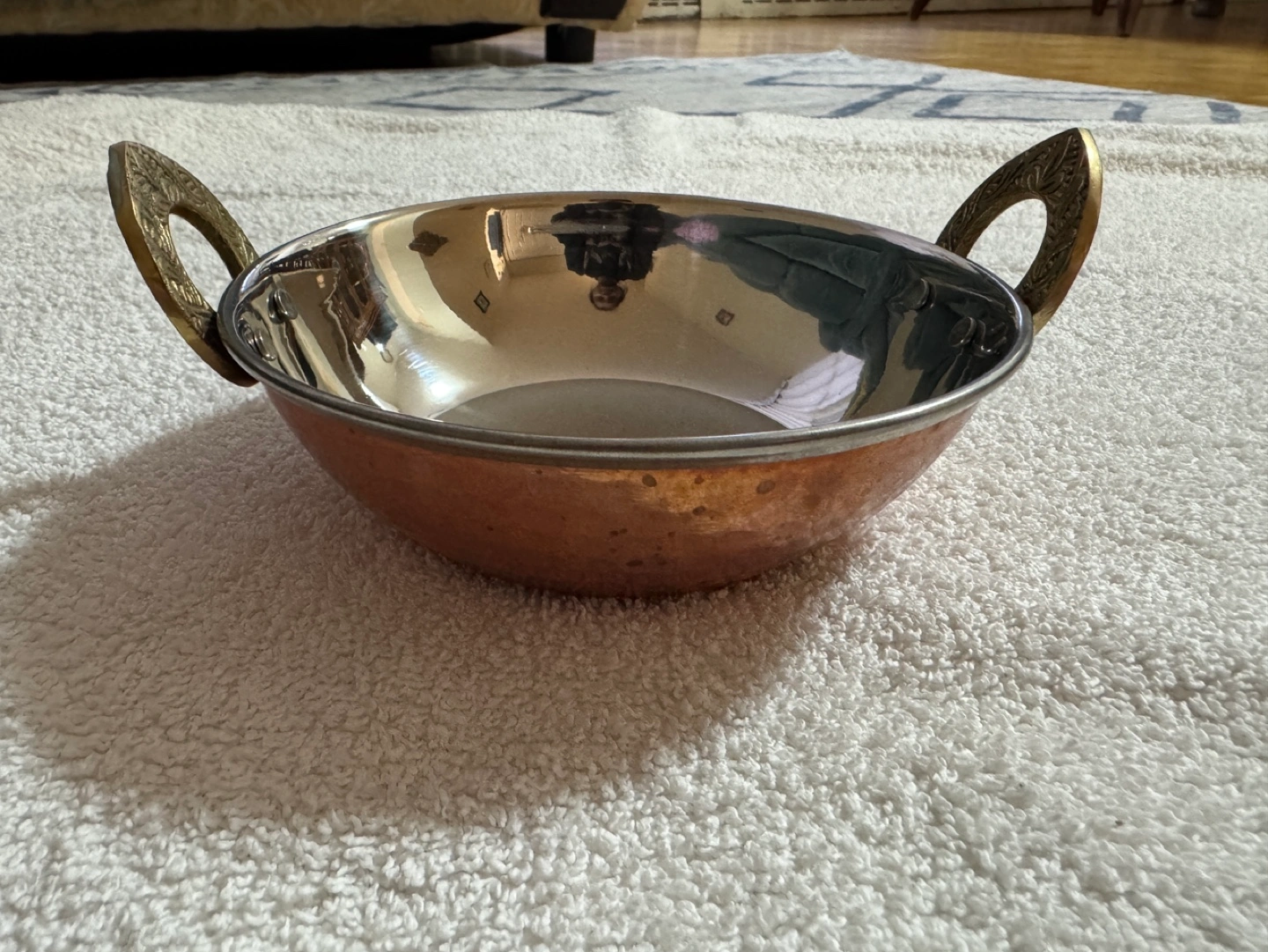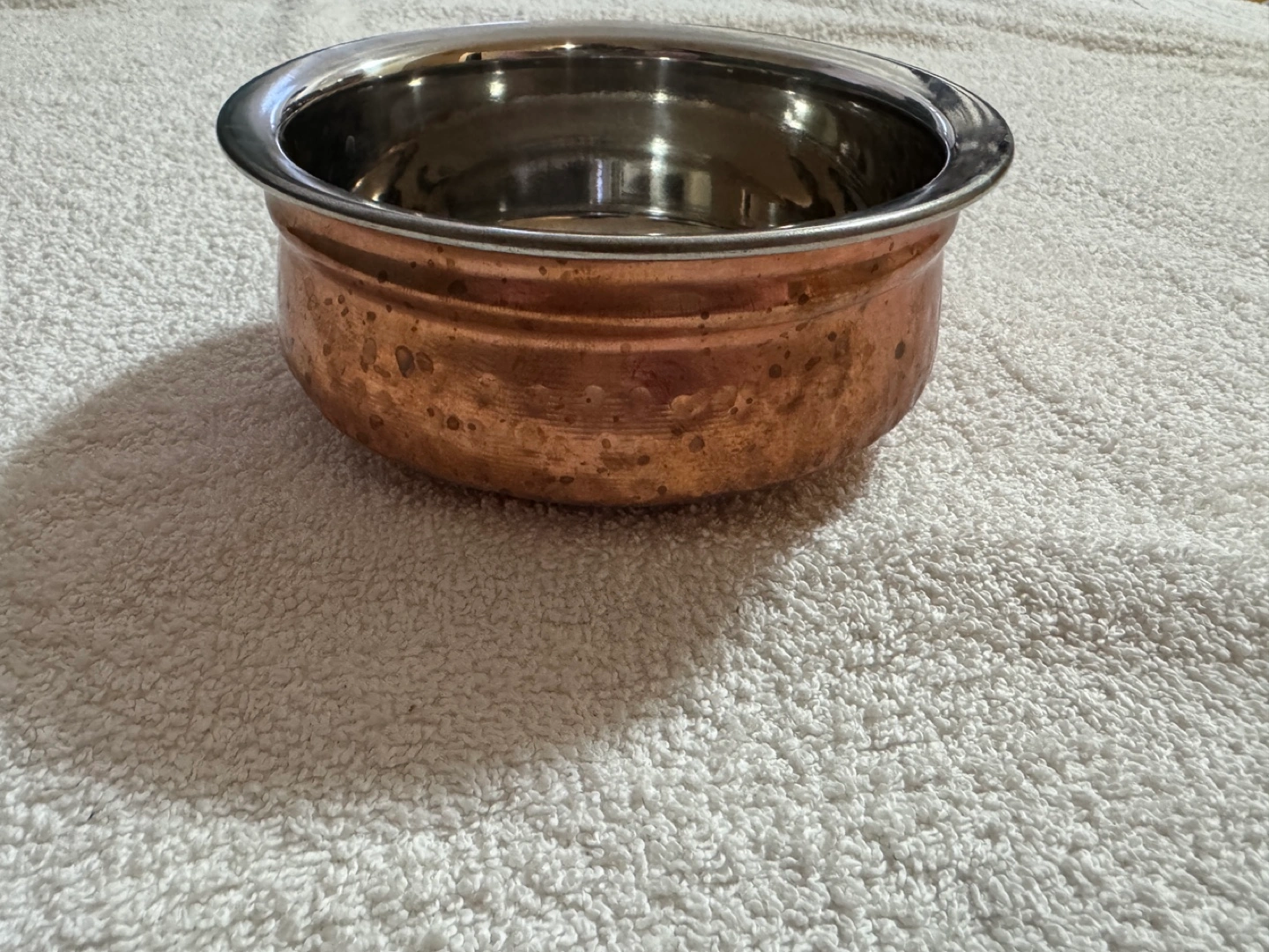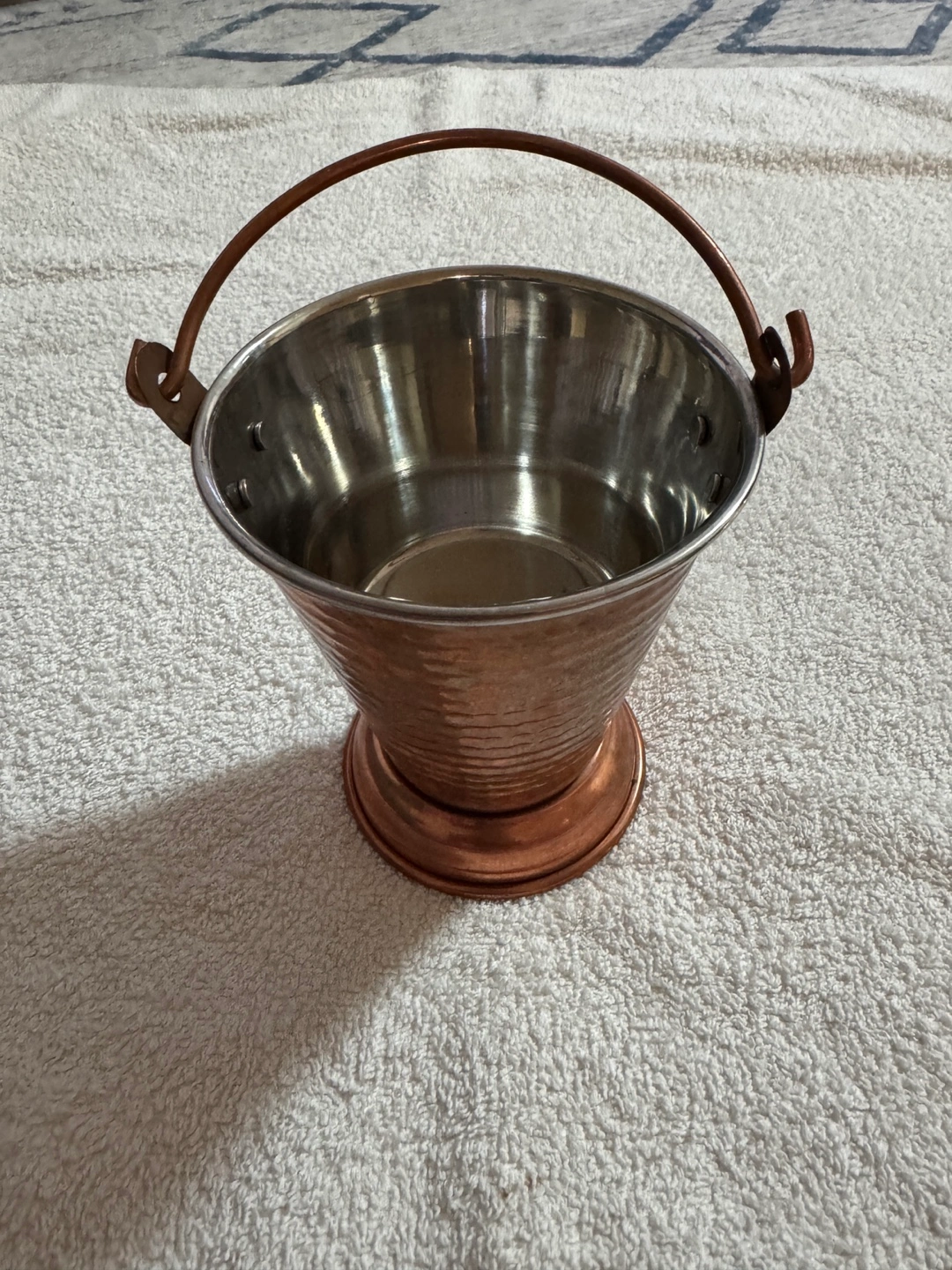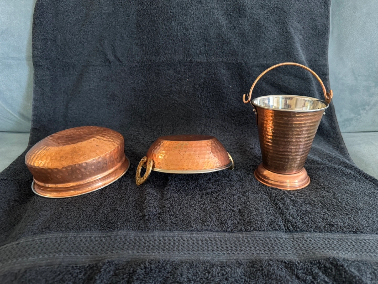 10Set of three copper hammered serving dishes. Two bowls and one ice bucket. Unique design. Perfect for serving snacks or chilling drinks.20$ for each if you buy 3 price is negotiable