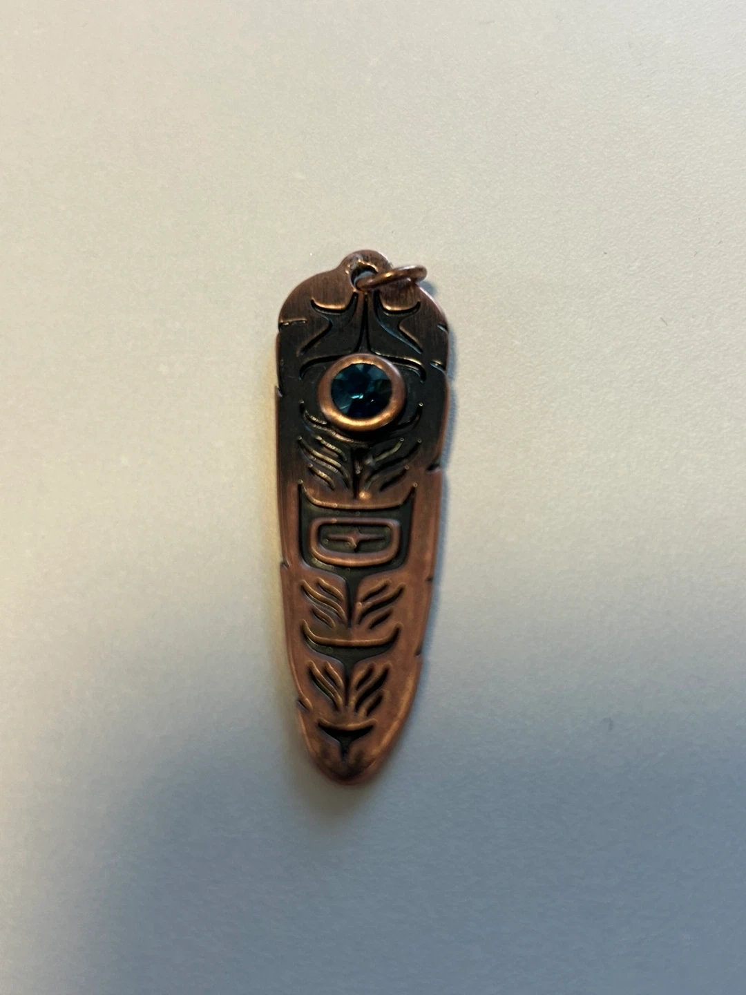 10This is a unique copper-coloured pendant with a lovely blue stone accent. It has a detailed design, making it a standout piece for any collection!