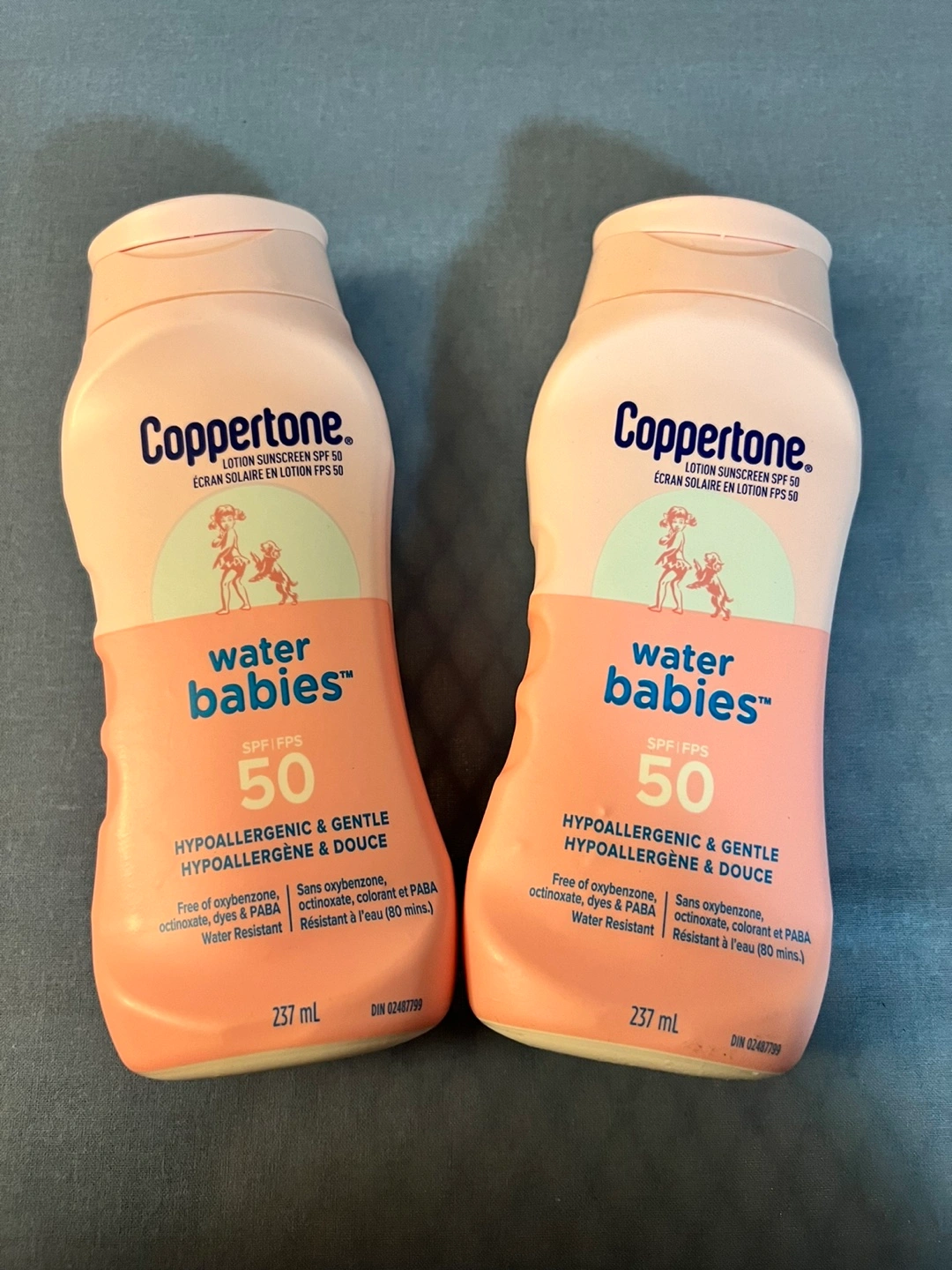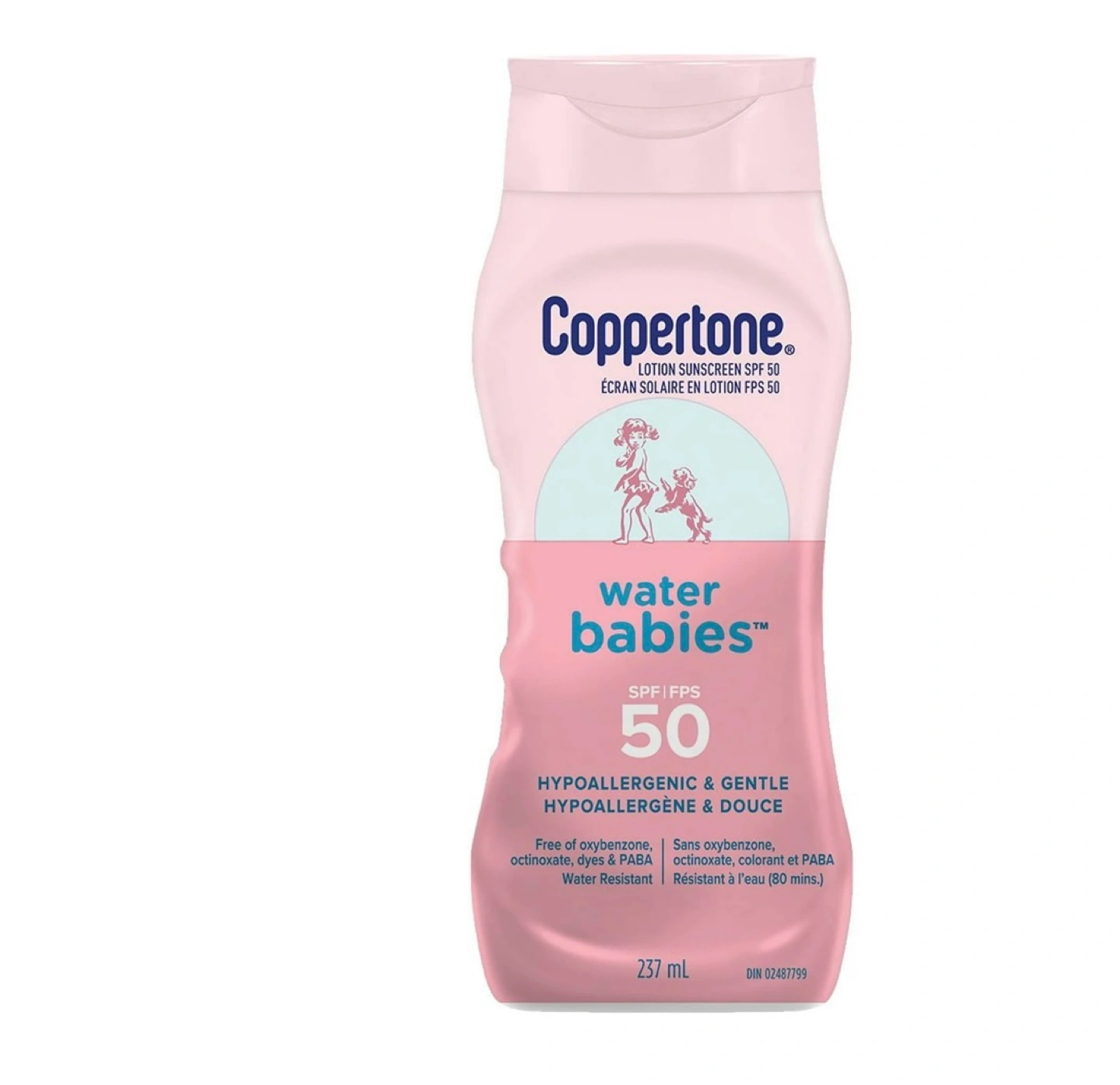 96Selling a bottle of Coppertone Water Babies SPF 50 sunscreen! It's hypoallergenic and gentle, perfect for sensitive skin. Provides water resistance for up to 80 minutes, so your little ones can play safely in the sun. The bottle contains 237 mL of sunscreen.