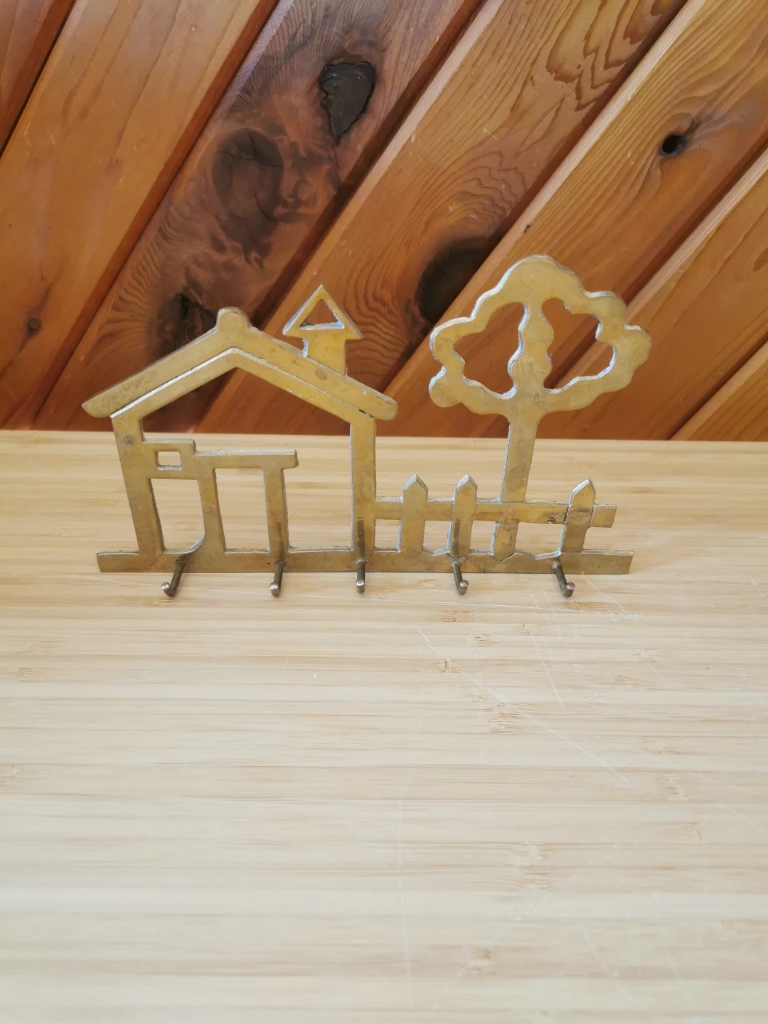 Charming vintage brass key holder featuring a detailed house, tree, and picket fence scene. Beautifully brass decor that adds character and rustic charm.