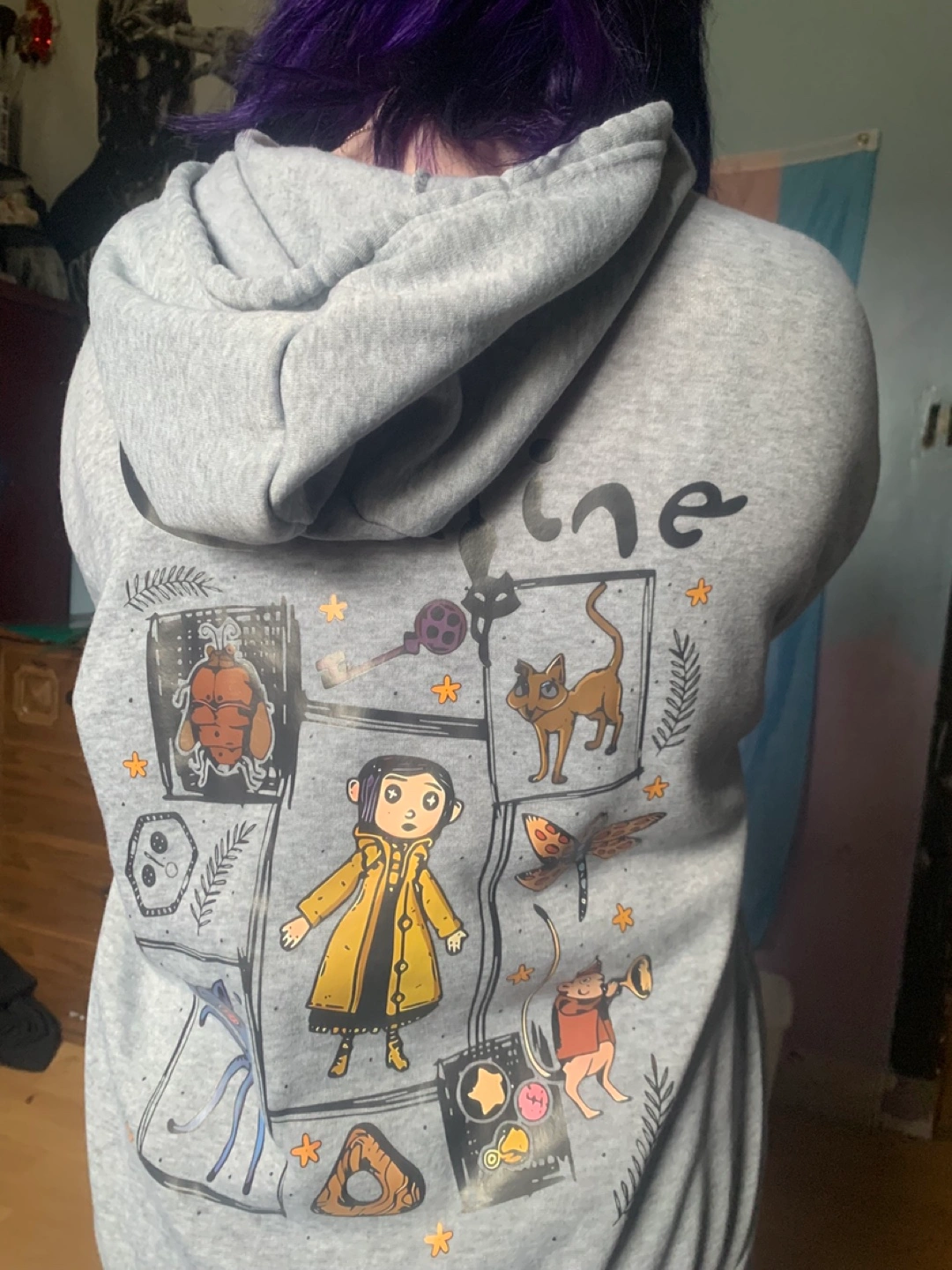 Selling a grey hoodie with a Coraline design on the back! It features Coraline in her yellow raincoat, along with other characters and symbols from the movie. It's in great condition and perfect for any Coraline fan