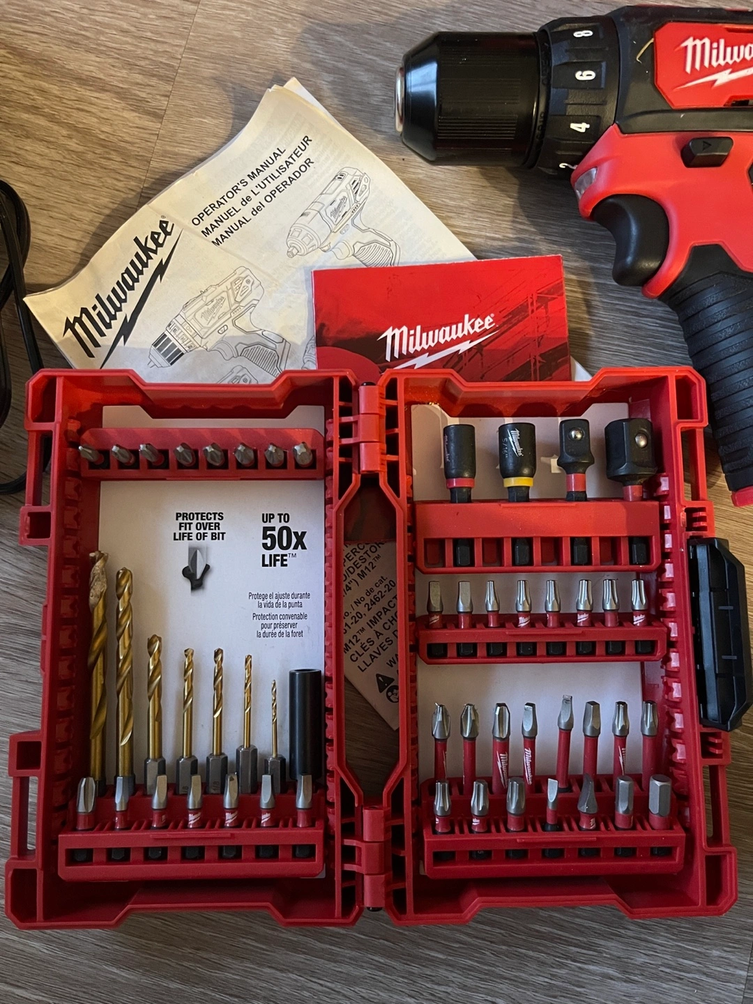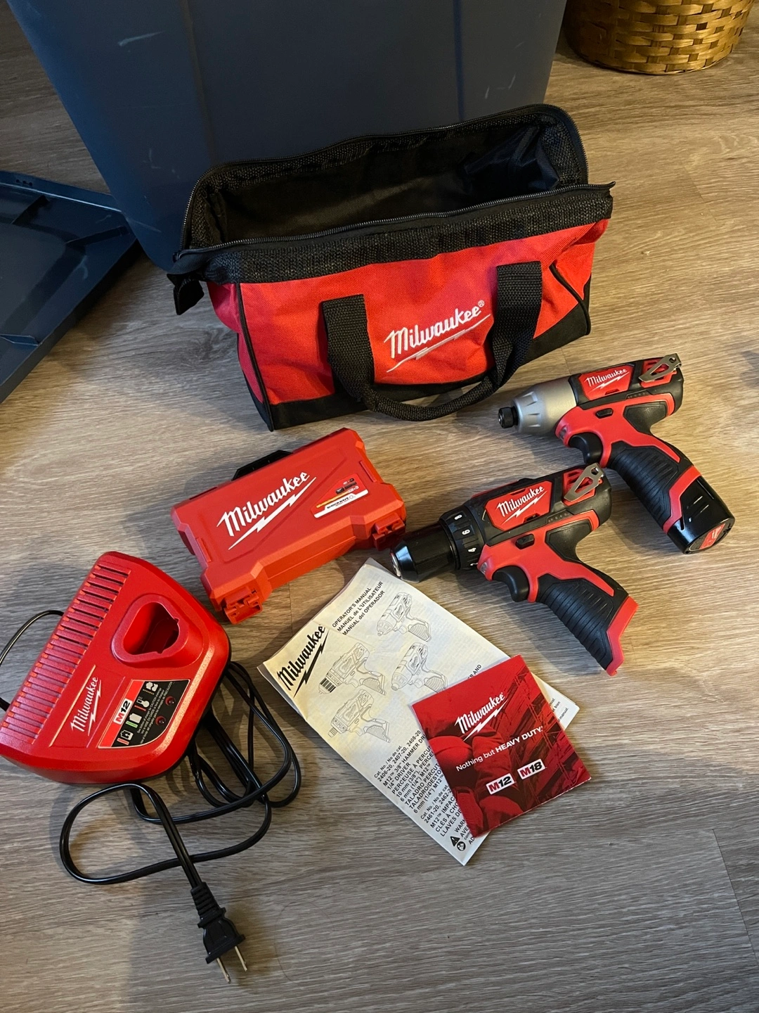 119Used once or twice, in like-new condition. Selling both as a combo- retails in total for $240 right now (see attached screenshots) The cordless 2-tool Combo kit includes the M12™ 3/8 in. drill/driver and the M12™ 1/4 in. hex impact driver. The innovative M12™ cordless lithium-ion system is designed to deliver the power and torque required for professional applications, in a size that reaches the tightest and toughest places. Powered by REDLITHIUM™, the M12™ cordless lithium-ion system offers unmatched power, speed, and tool belt portability. 3/8" drill/driver delivers up to 275 lbs of torque, 0-400/ 0-1,500 RPM and a metal ratcheting chuck for maximum durability 1/4" hex impact driver delivers up to 1000 in. lbs. of torque and 0-2500 RPM for fast, powerful driving On-board battery fuel gauge displays remaining run time Ergonomic handle design for increased comfort INCLUDES M12 3/8" drill/driver M12 1/4" hex impact driver (2) M12 REDLITHIUM CP 1.5 Ah batteries (48-11-2401) M12 lithium-ion battery charger (48-59-2401) Contractor bag 50 piece shockwave duty impact drill bit set: Includes: (1) Compact Magnetic Bit Holder, (30) 1" Insert Bits: P1, (4) P2, (2) PR2, (2) P3, SQ1, (4) SQ2, (3) SQ3, T15, (2) T20, (5) T25, T30, SL #6, SL #10, Hex 3/16", Hex 1/4", (8) 2" Power Bits: (2) P2, P3, (2) SQ2, SQ3, T20, T25, (2) 1-7/8" Magnetic Nut Drivers: 1/4", 5/16", (1) 1/4" to 3/8" Hex to Square Socket Adapter, (1) 1/4" to 1/2" Hex to Square Socket Adapter, (7) Hex Drill Bits: 1/16", 3/32", (2) 1/8", 3/16" with QUAD EDGE TIP , 7/32" with QUAD EDGE TIP, 1/4" with QUAD EDGE TIP