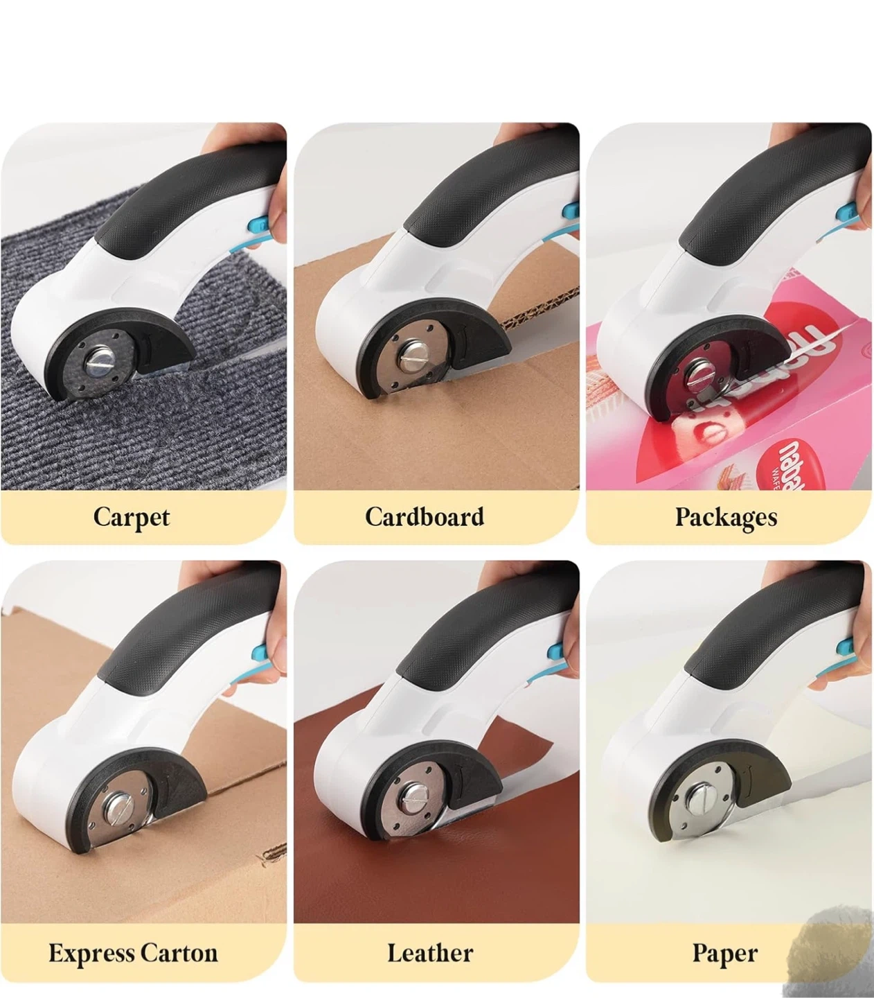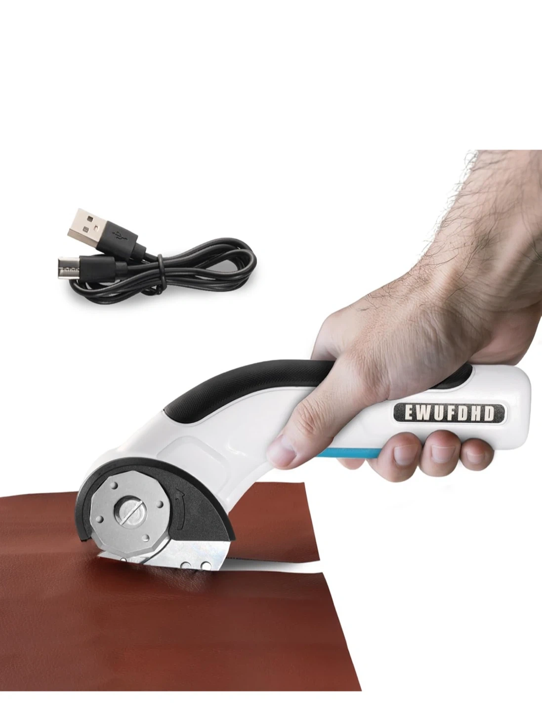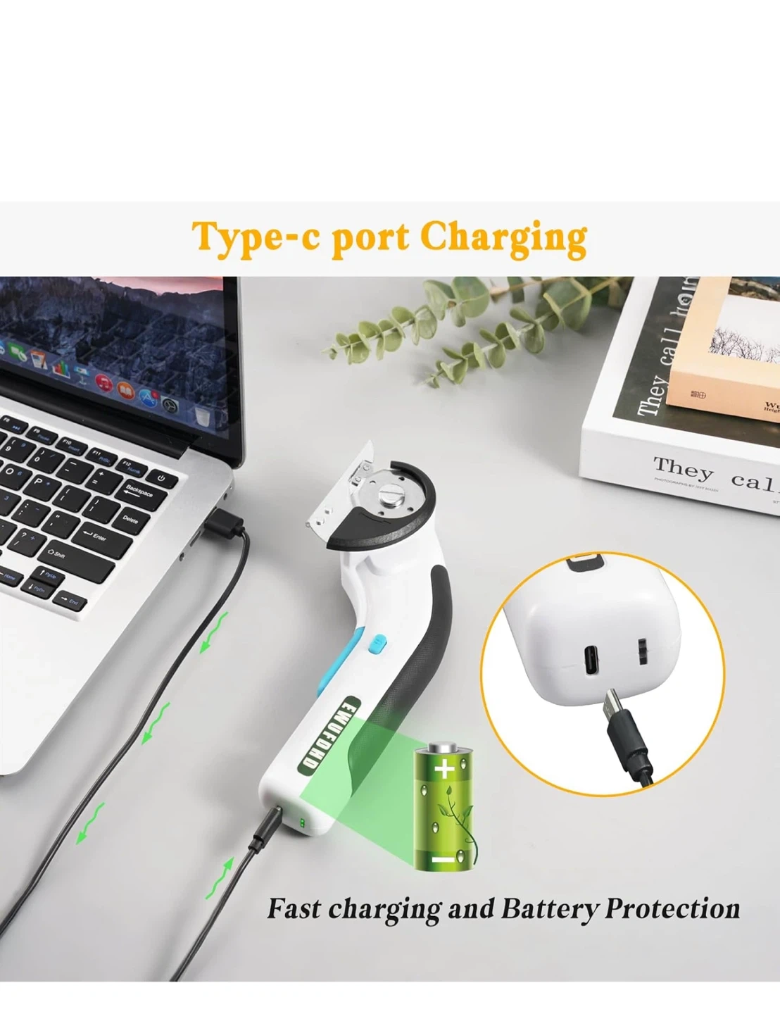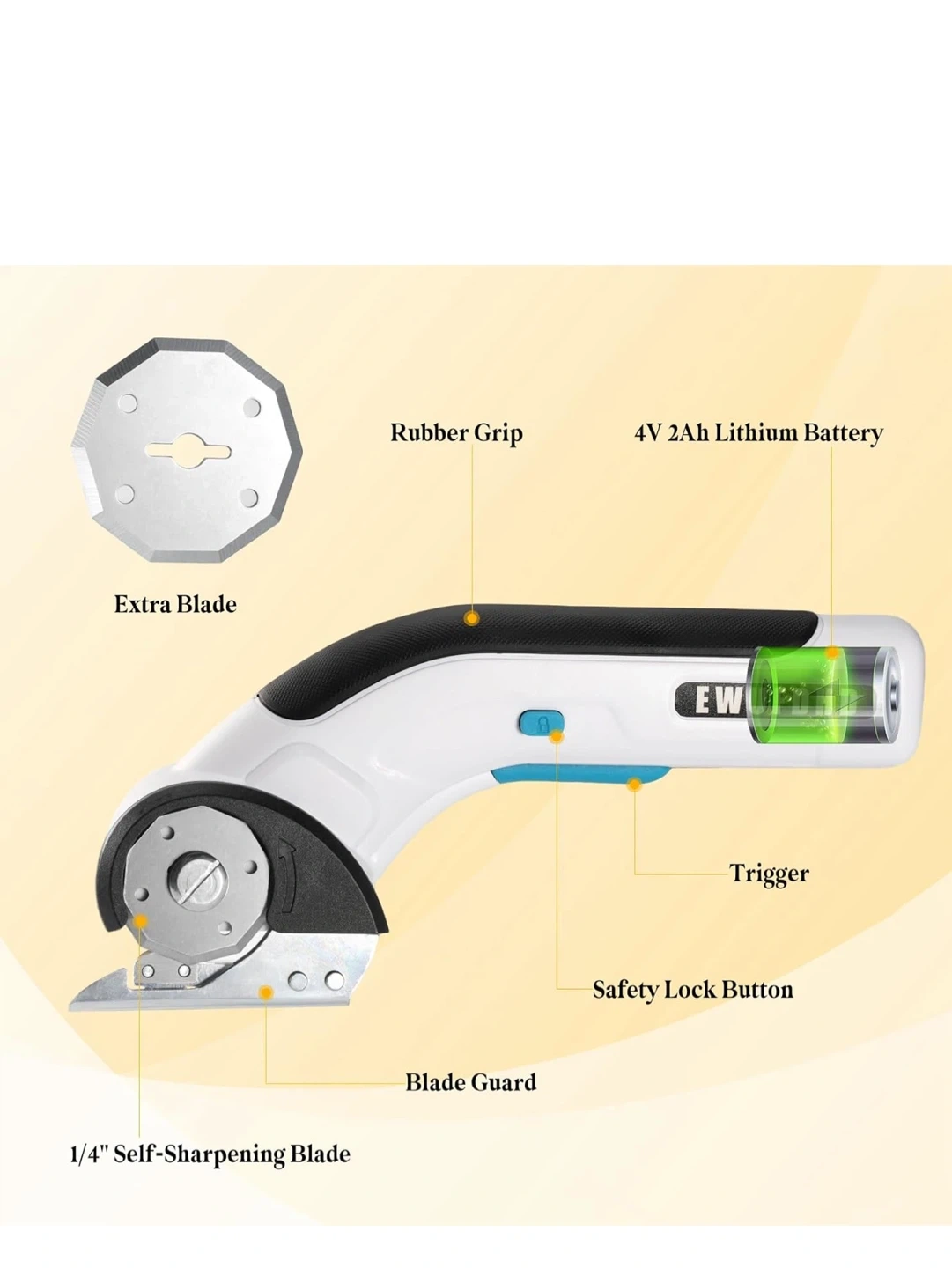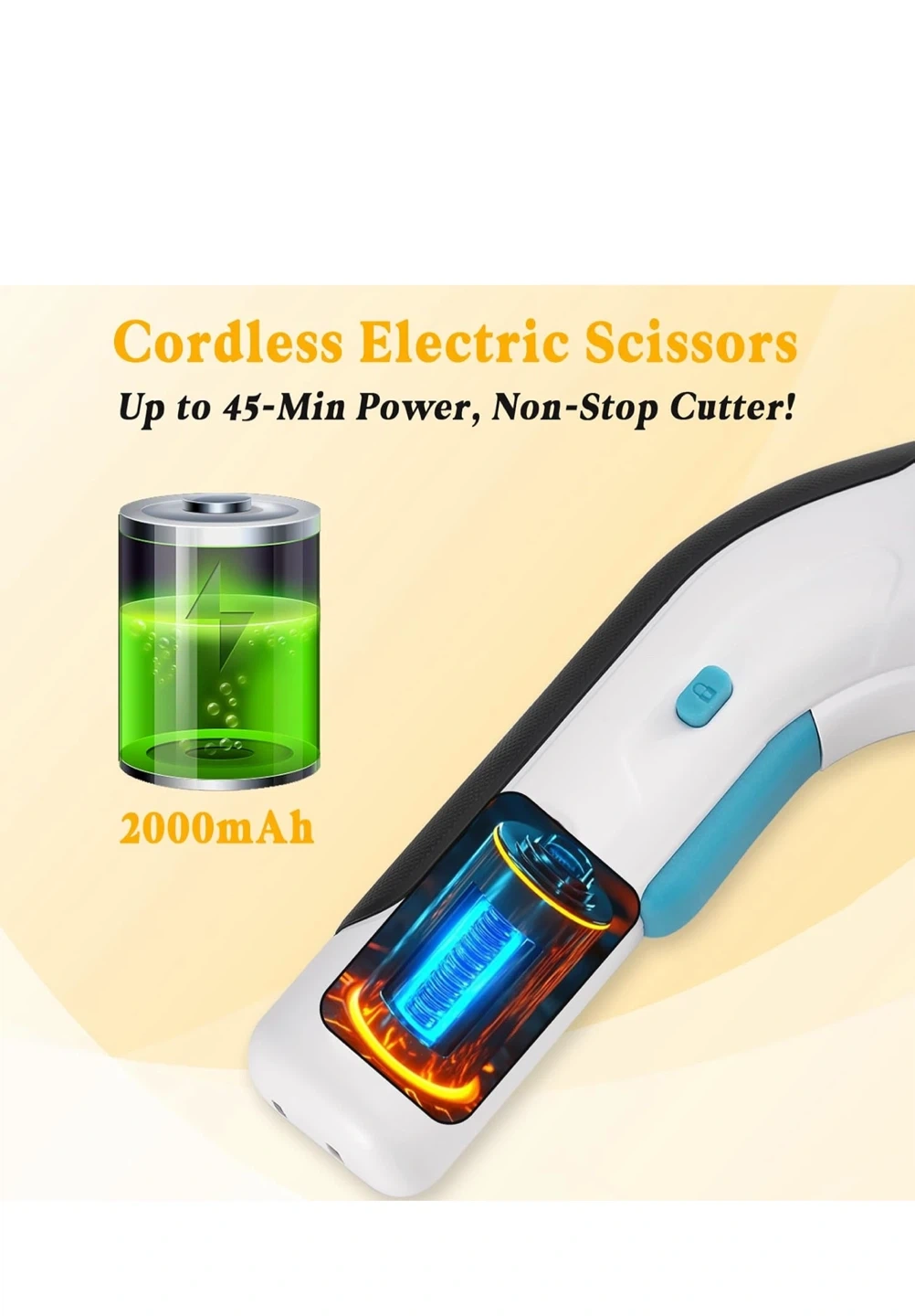 Cordless electric scissors with up to 45 minutes of power, non-stop cutter! It comes with a Type-C port for charging, fast charging and battery protection. The battery is 2000mAh. It also features a rubber grip, 4V 2Ah lithium battery, extra blade, trigger, safety lock button, blade guard, and a 1/4" self-sharpening blade