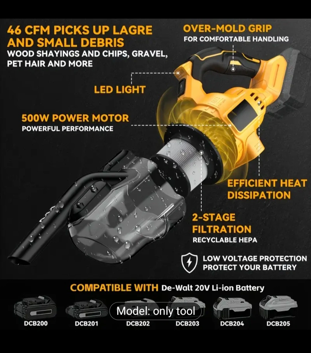 This cordless handheld vacuum cleaner is perfect for quick cleanups around the house or in the car! It features a powerful 500W motor, providing strong suction performance. The vacuum includes multiple attachments to meet your various usage needs, such as a floor nozzle, crevice nozzle, long strip brush, and head brush. It also has a 2-stage filtration system with a recyclable HEPA filter for efficient heat dissipation and low voltage protection for your battery