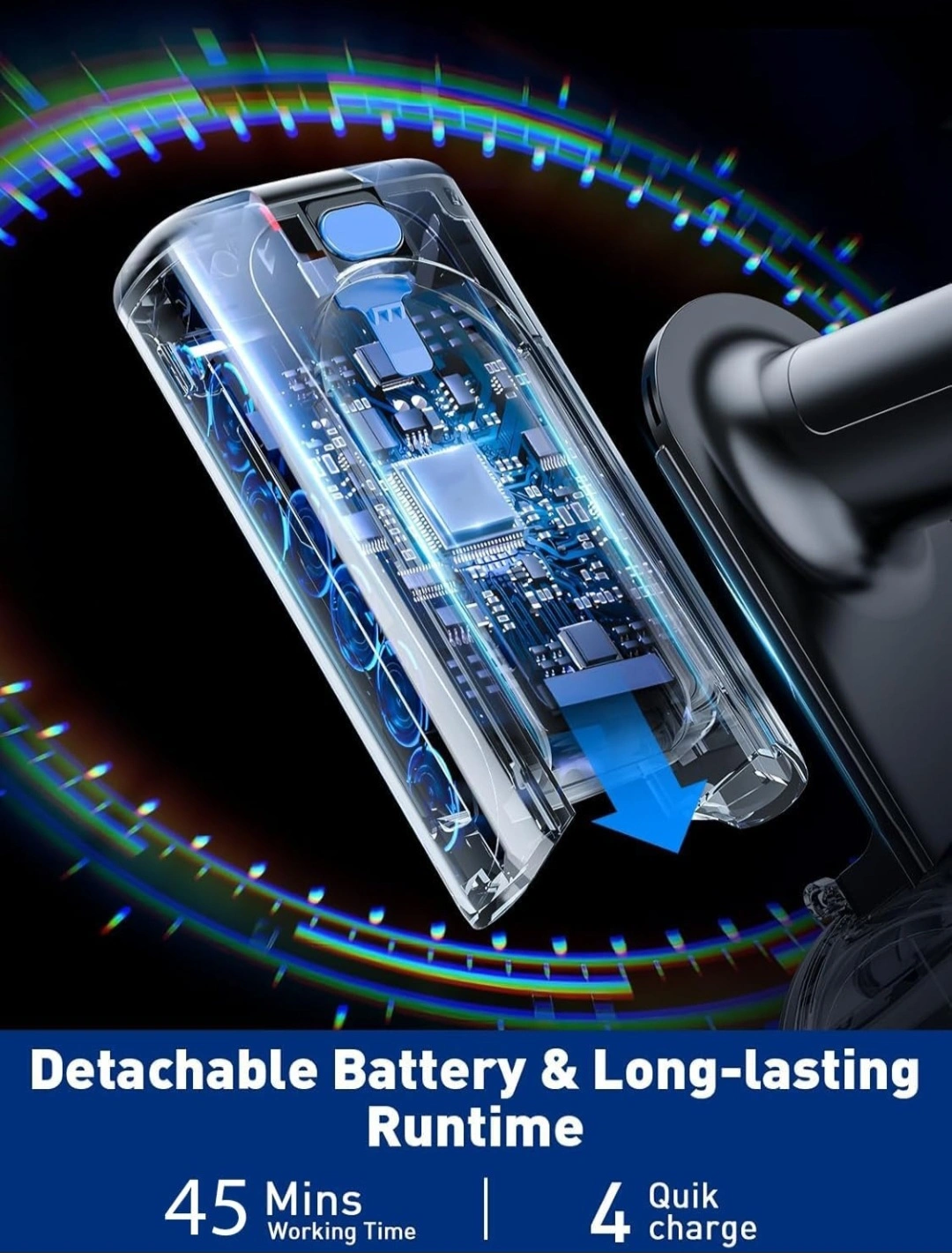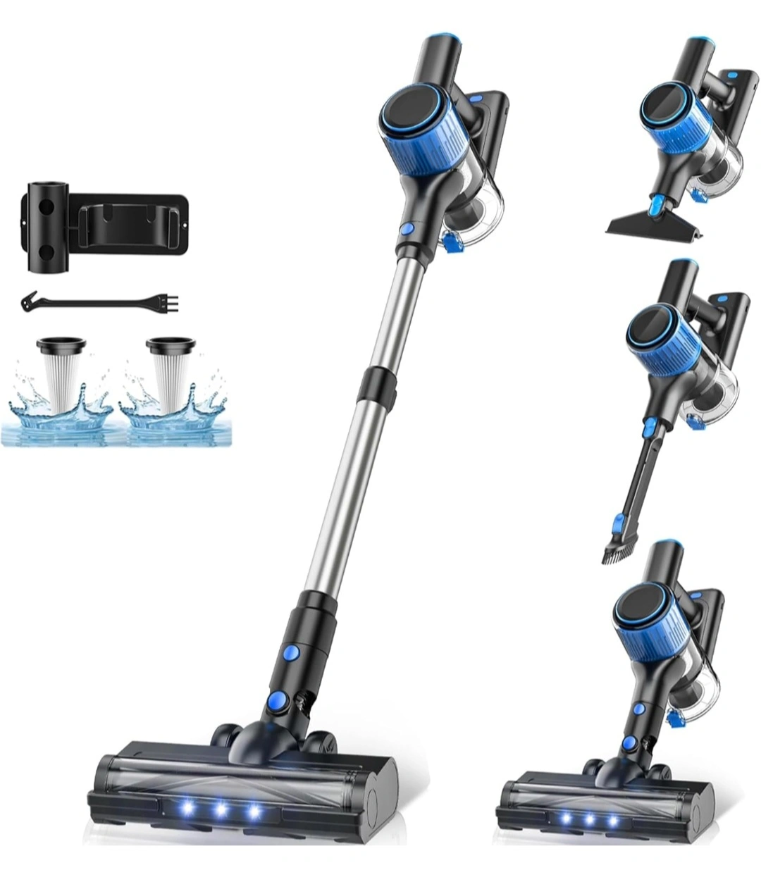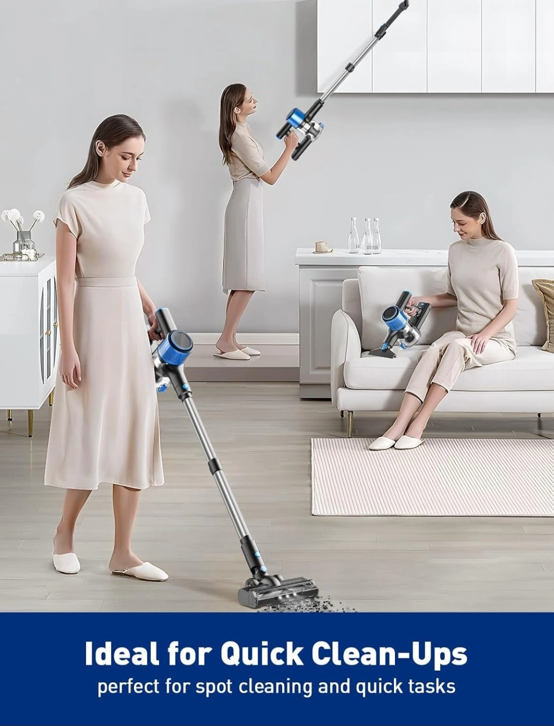 This cordless stick vacuum cleaner is perfect for quick clean-ups around the house! It features a detachable battery for long-lasting runtime and a 6-stage HEPA filter to capture allergens and fine dust particles. It's ideal for multi-surface cleaning, powerful enough to clean carpets, hardwood floors, and tiles, blue in color, only box open never used once.