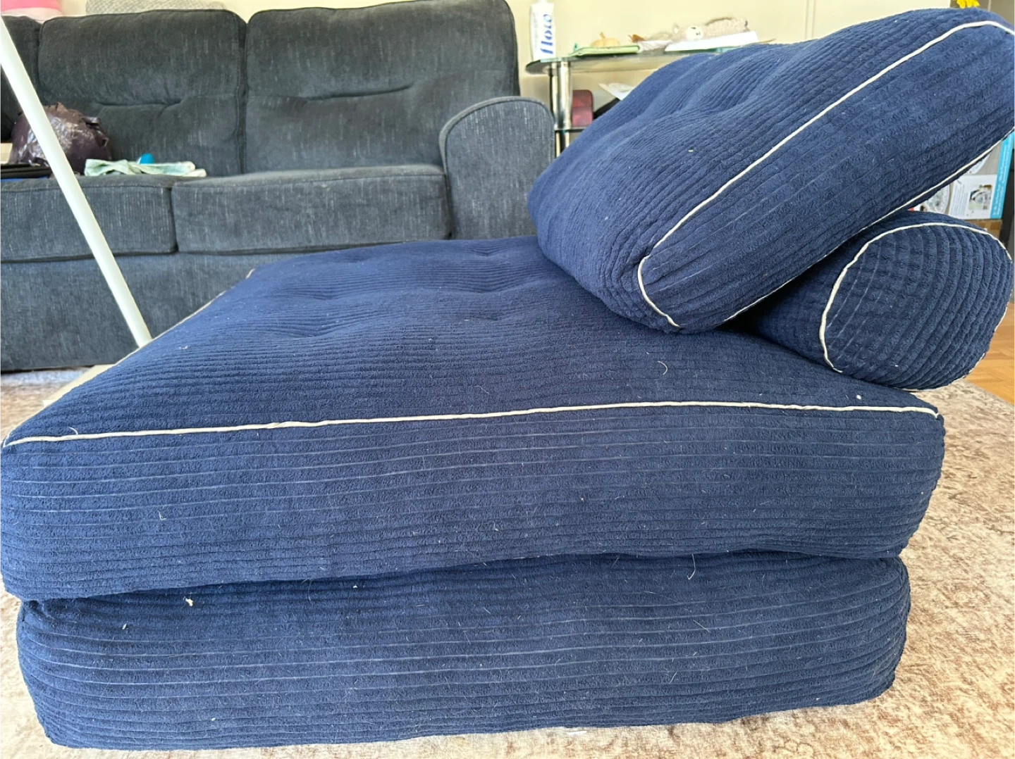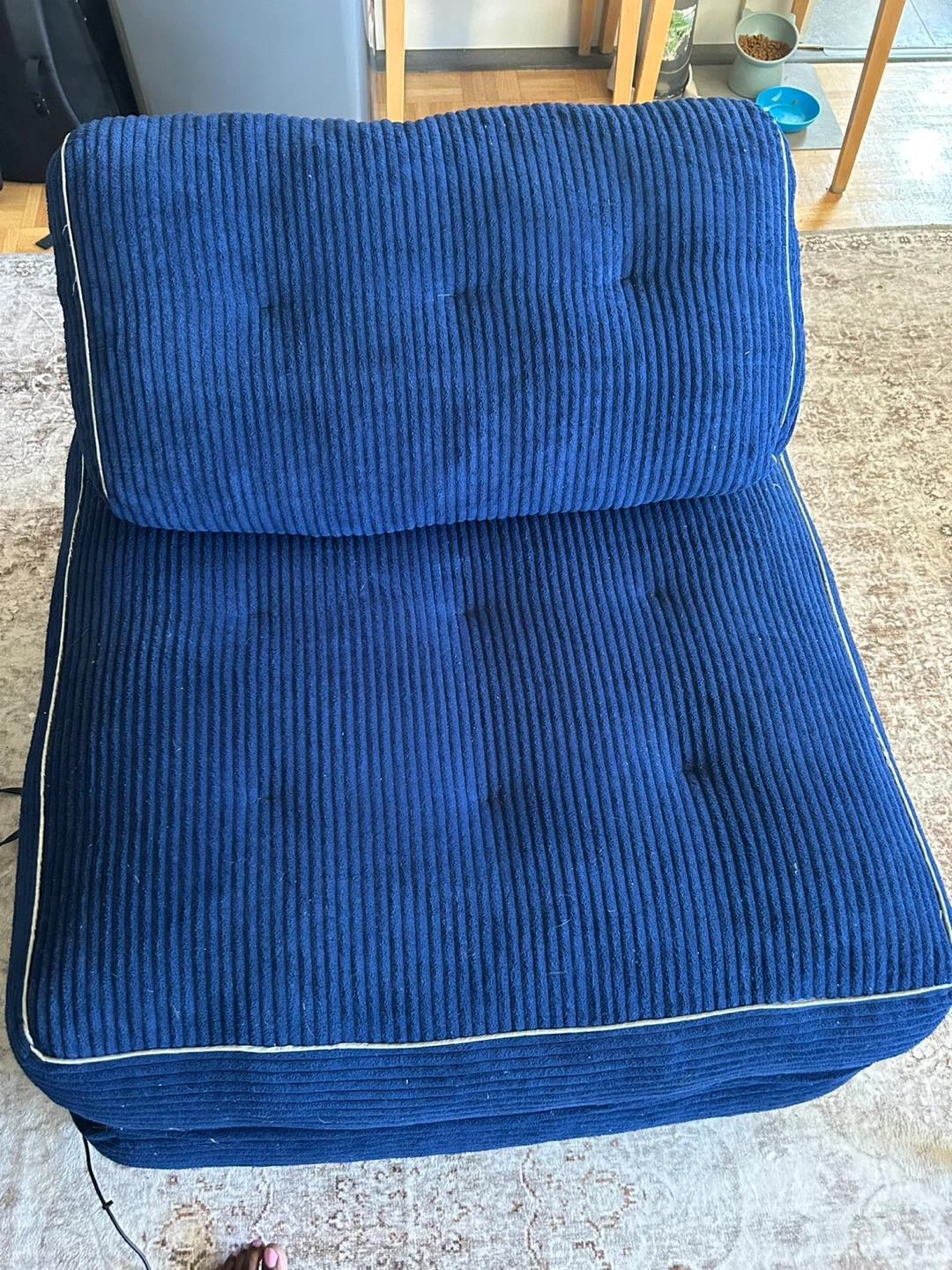 This comfy navy blue corduroy chair is perfect for any room! It's in great condition and ready for a new home. The chair features a soft, textured corduroy fabric and a relaxed design, making it ideal for lounging or reading. It's a versatile piece that can easily fit into various decor styles It is a folding sofa chair, converts to a floor seat/ futon