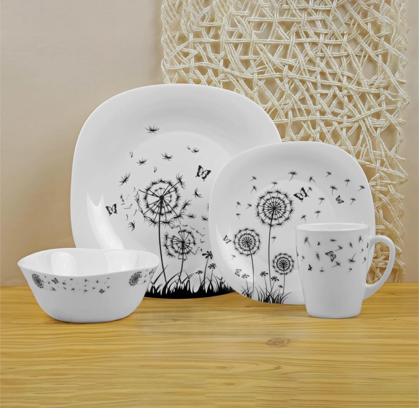100This Corelle dinnerware set features a lovely dandelion design. It's made of lightweight opal and has a simple design that fits in any kitchen. The set includes plates, bowls, and a mug. It's also dishwasher, microwave, and freezer safe. One cup was broken.