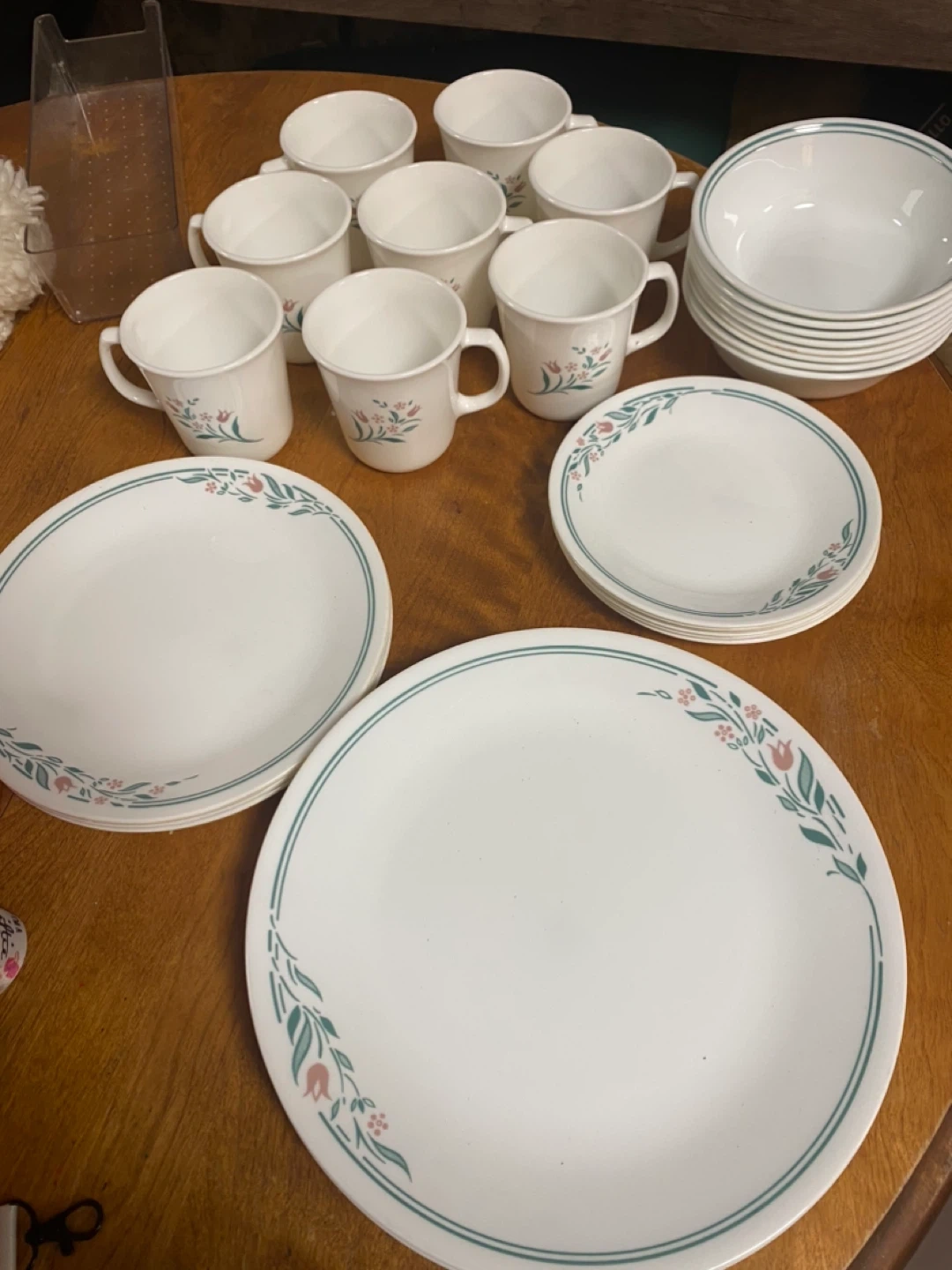 Corelle dishes, 7-large plates, 4- medium plates, 6- small plates, 8-bowls, 8-mugs, all in great condition. $25.00 for all. PICKERING WHITES RD & STROUDS LANE
