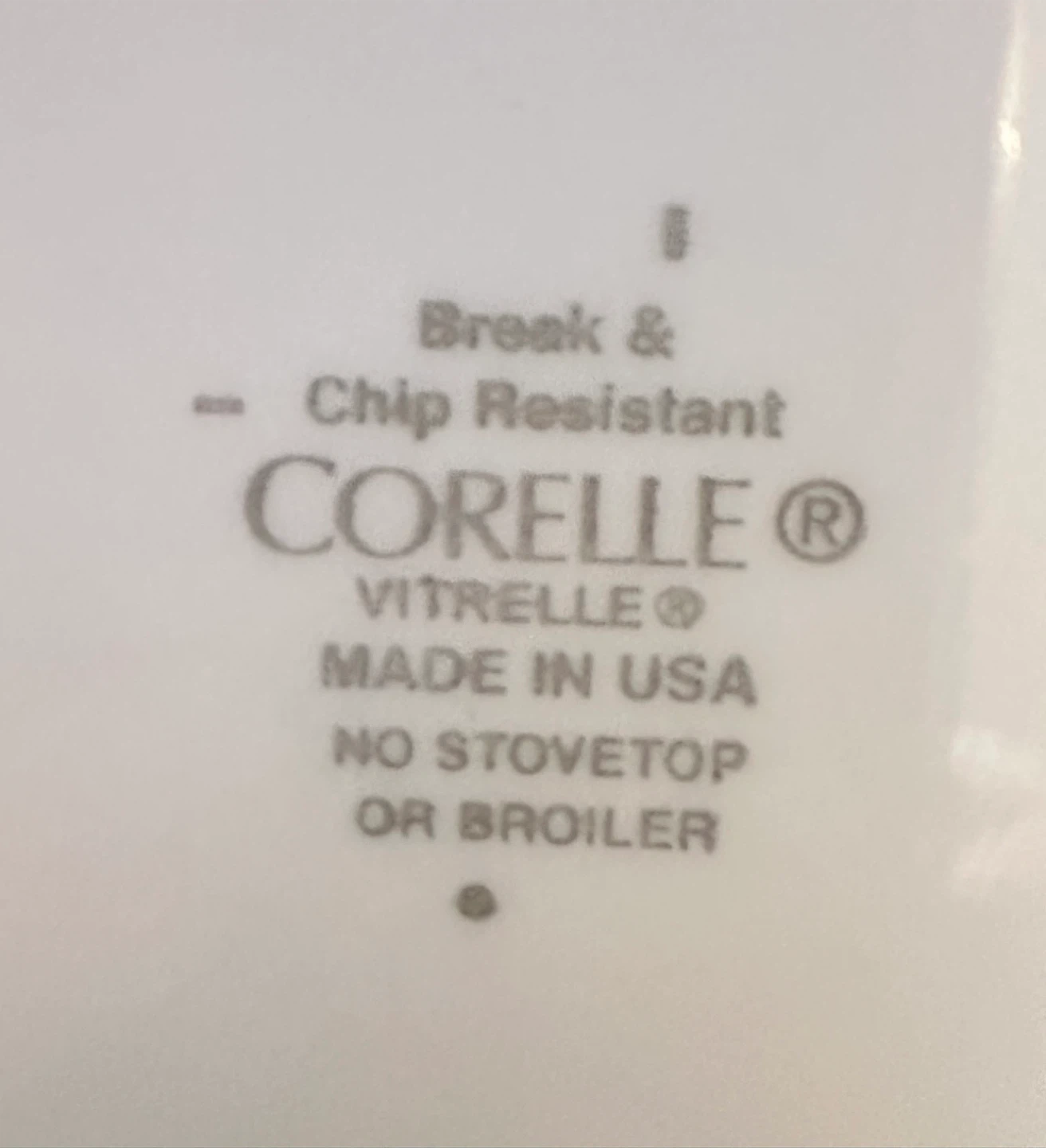 75Selling a set of white Corelle soup bowls. They are break and chip resistant, and made in the USA. They are about 10.5 inches in diameter. Great for everyday use!