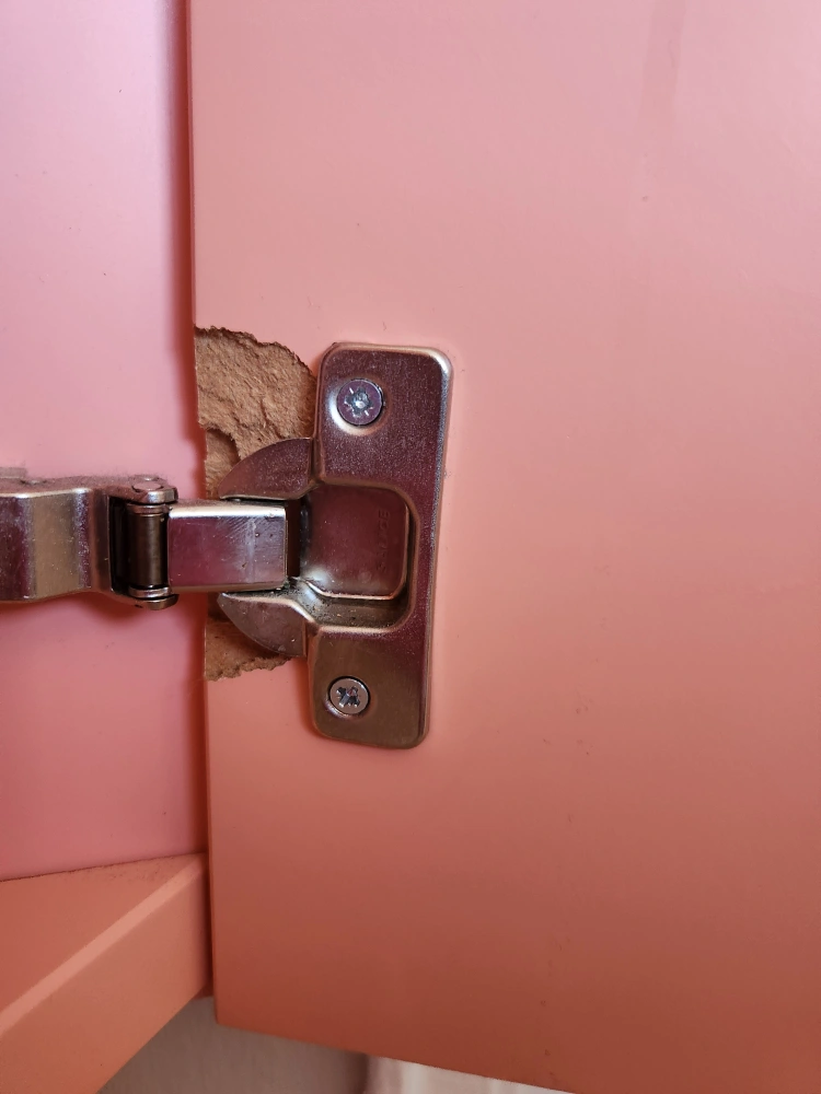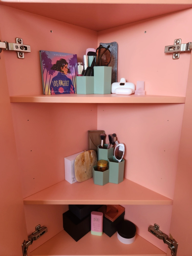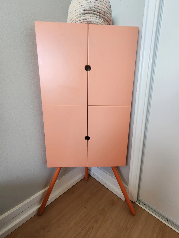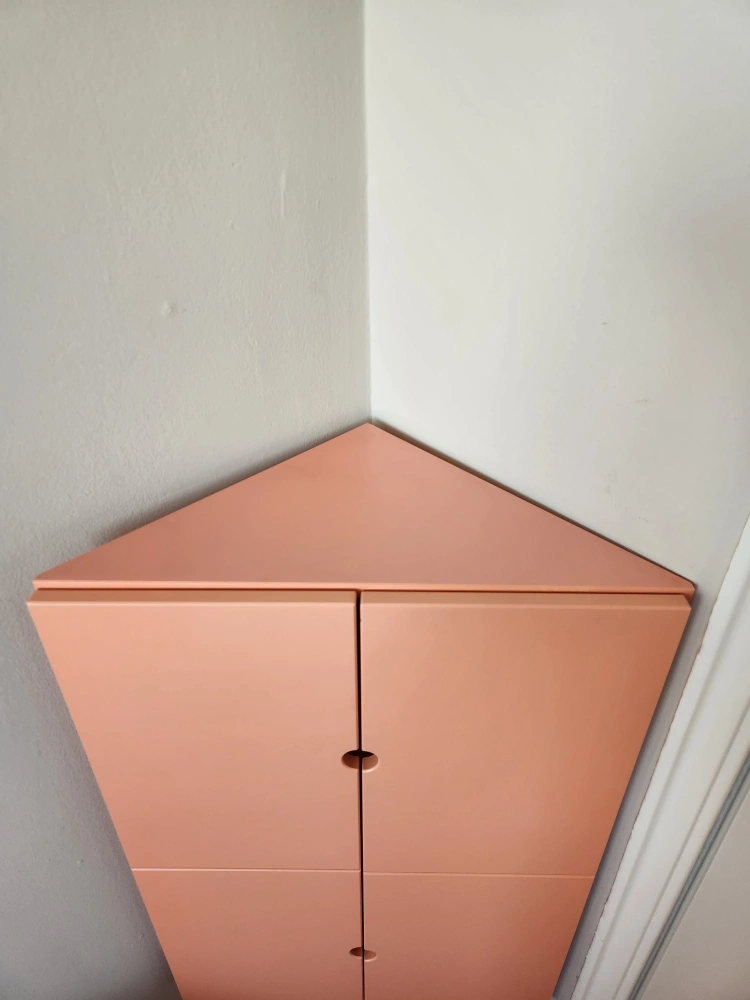 Selling a corner cabinet in a peach colour. It has a few shelves inside for storage. There is some damage to one of the doors near the hinge, as shown in the pictures. It's still a functional and stylish piece for any room! Let me know! 😎✨
