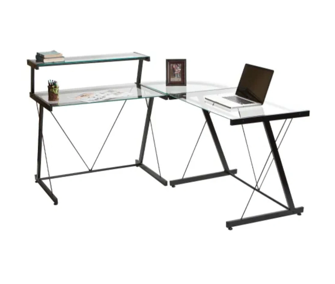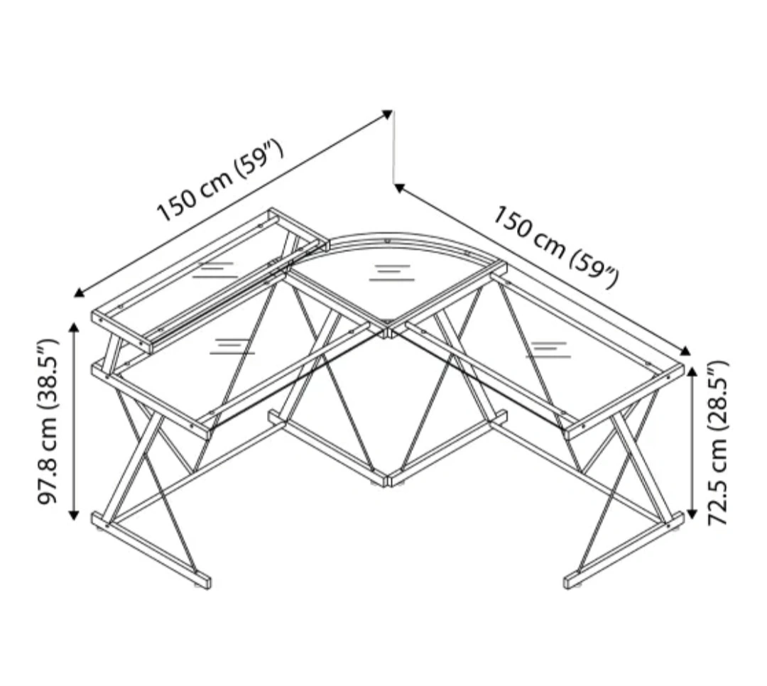 Looking to sell a corner desk with a glass top. It's a great fit for any home office or study space. The desk measures 59 inches on each side, providing ample workspace. The height is approximately 38.5 inches on one side and 28.5 inches on the other, offering a unique design. Perfect for maximizing corner space!