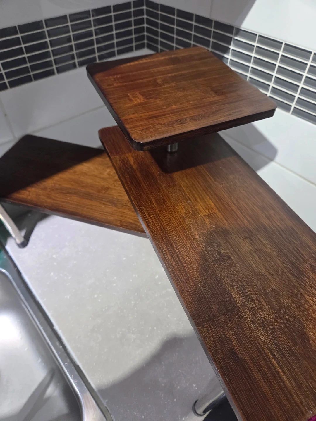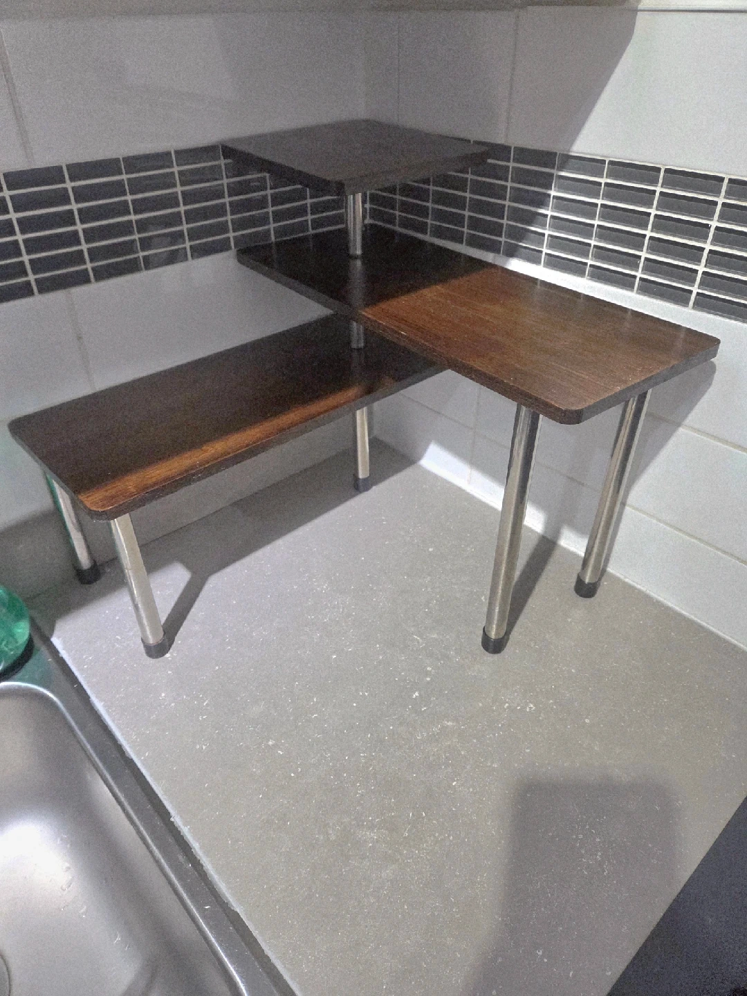 15Selling a corner shelf rack in a dark wood finish. It's perfect for adding some extra storage to your kitchen or bathroom. The shelves are in great shape and ready to use! It can also be straightened to sit flat against counter wall.