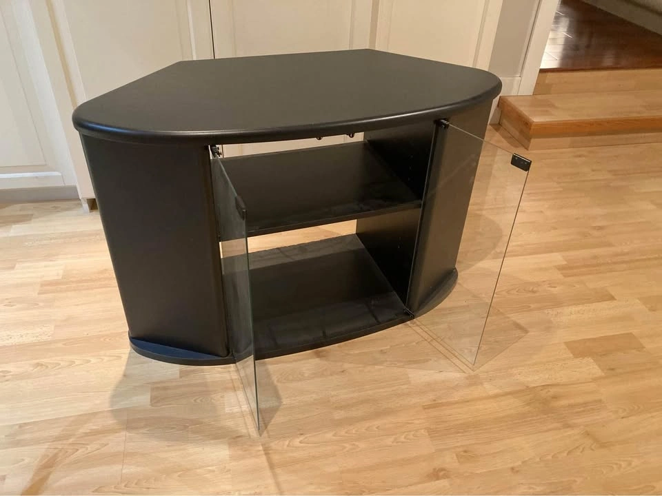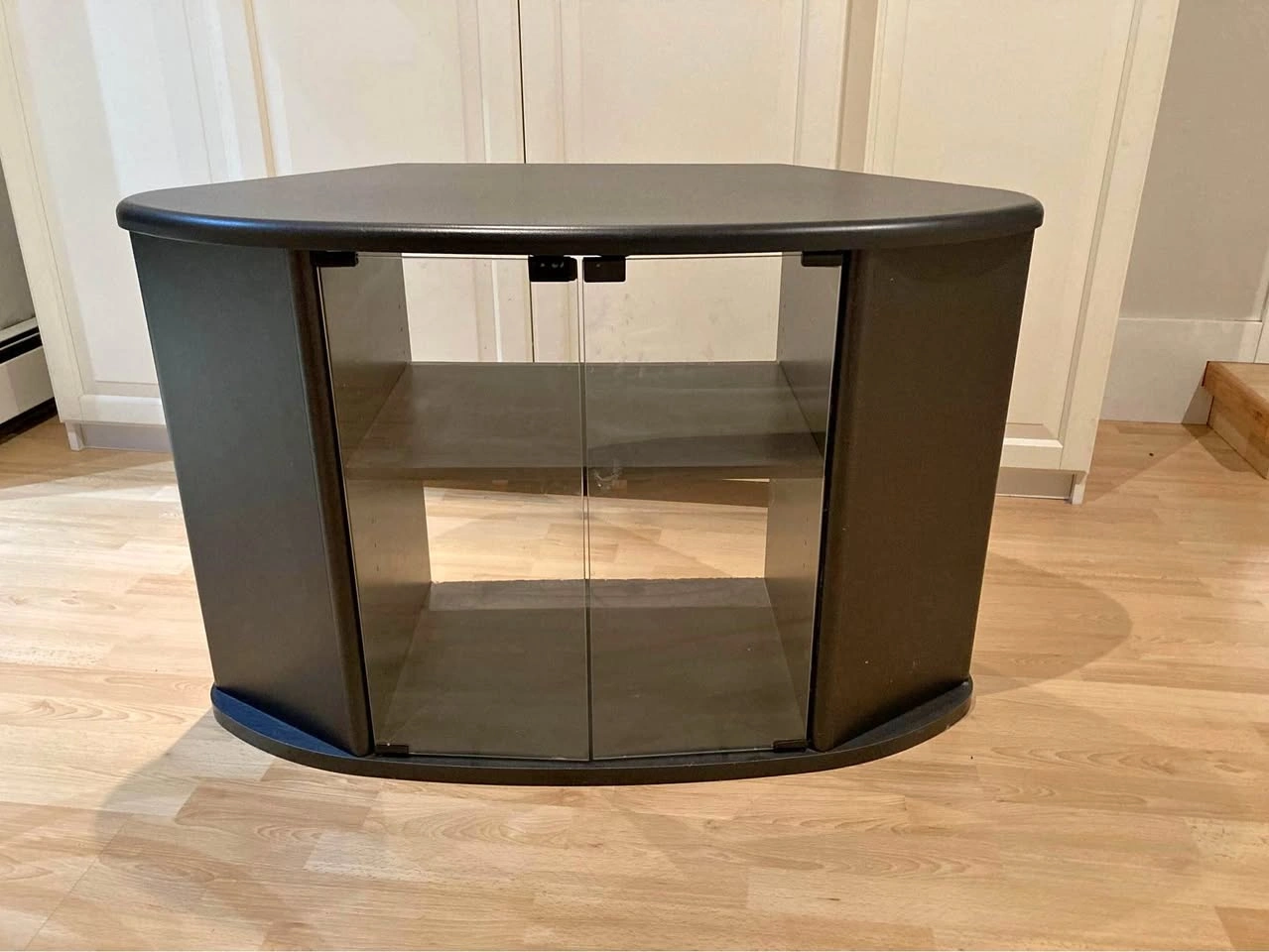 Black corner TV stand with glass doors. It's older but still in usable condition. The widest dimension at the front is 39", it is 17.5" deep and 26" tall.