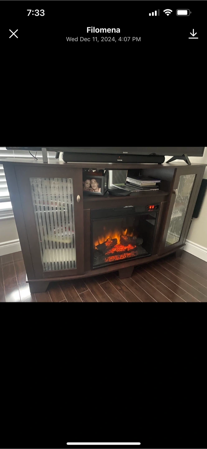 10Selling a corner TV stand with an electric fireplace insert. It has a dark wood finish and glass doors on the sides. Great for adding warmth and style to your living room!