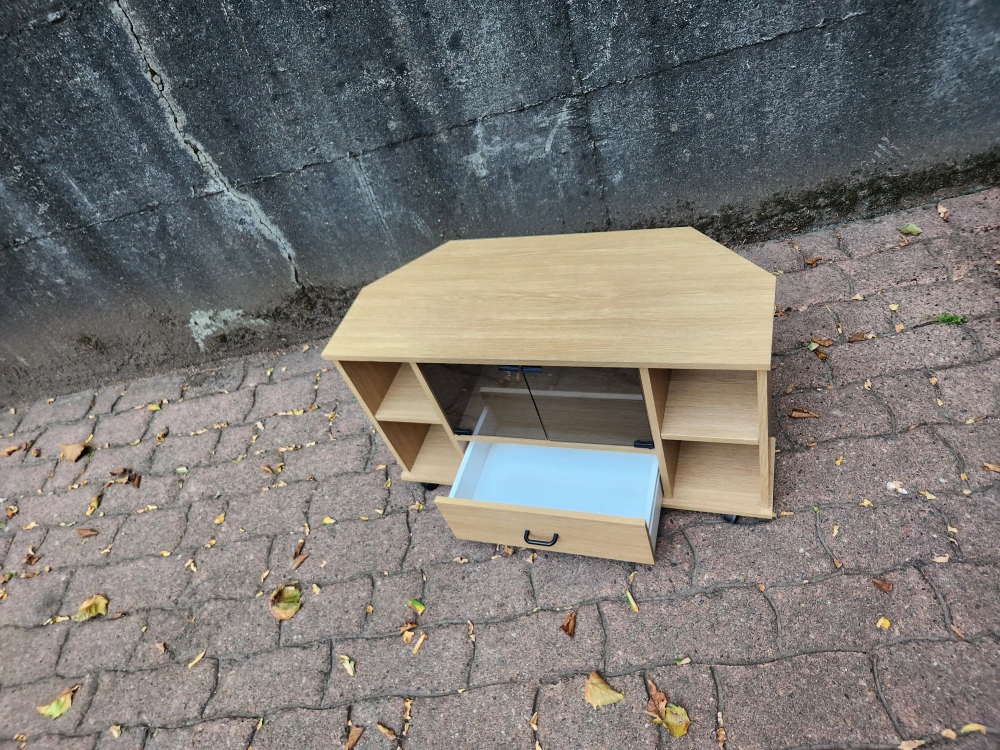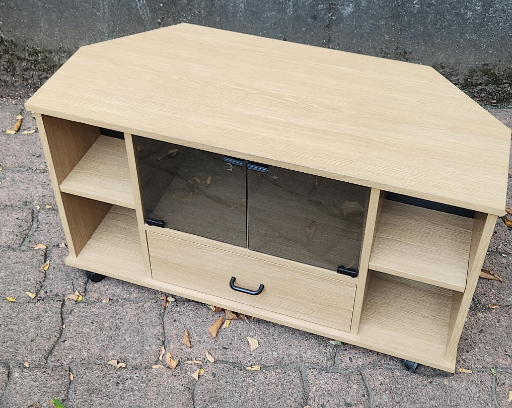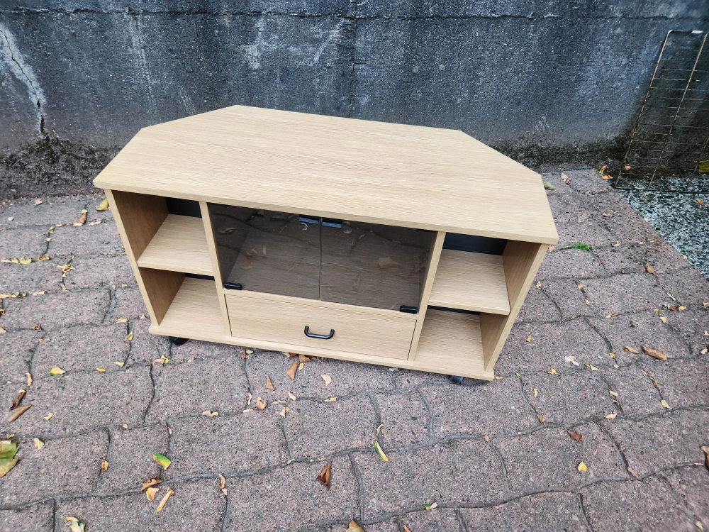 Looking to sell this corner TV stand! It has a light wood finish and comes with a drawer and shelves, perfect for storing your media and accessories. The glass doors give it a sleek look, and it's on wheels for easy moving.