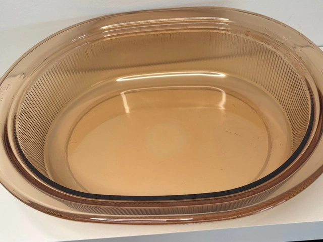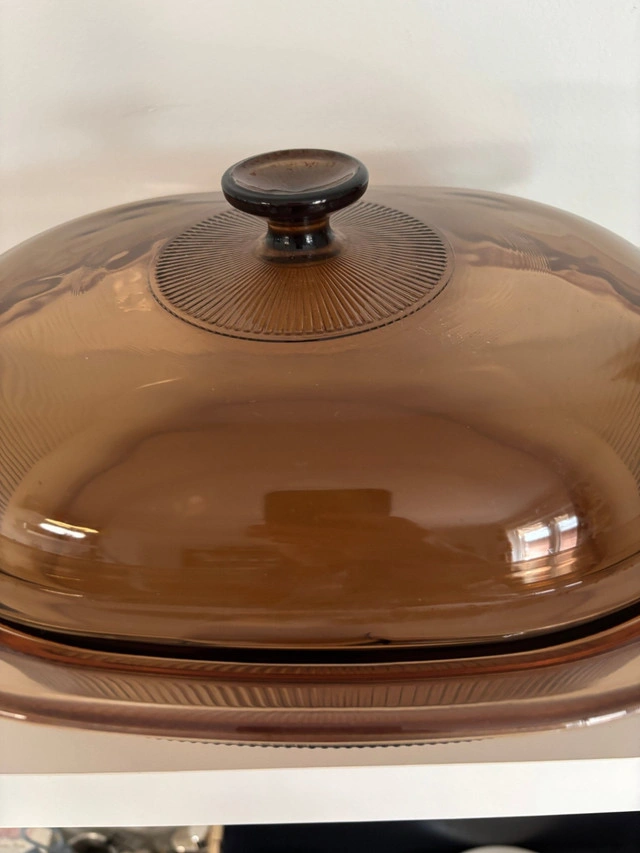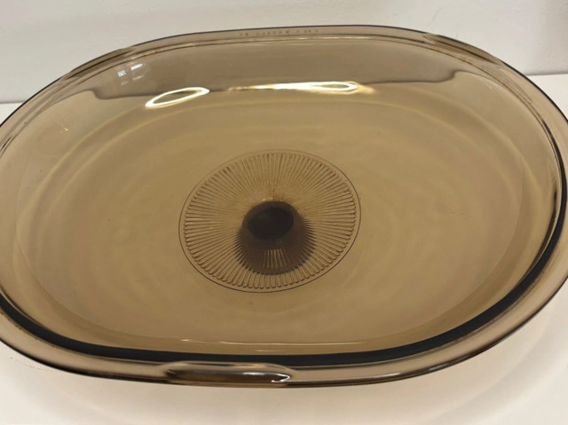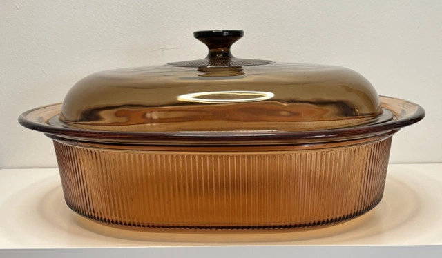 Cook with confidence, style and durability using the Corning Vision 4 Quart Roaster Casserole Dish. Made from heat resistant amber glass, this versatile casserole dish is perfect for baking, roasting, and serving larger meals like roasts, chicken or lamb. Its smoke finish still lets you monitor your food while cooking while giving it that beautiful mid century modern appeal. This wonderful Corning vision dish will help prevent absorption of food odors or flavors and is perfect for oven to table use. Perfect for preparing hearty casseroles or roasting meats, this classic Corning Vision dish delivers even heating with a timeless look that will accent your kitchen and serving ware with charm. This Corning Vision 4 Quart Roaster Casserole Dish measures approximately 15 inches or 39cm long, 12 inches or 31cm wide and 6 inches or 16cm deep and although pre loved, is in excellent condition with no signs of prolonged use. Local pickup is in Etobicoke near Islington and The Westway.