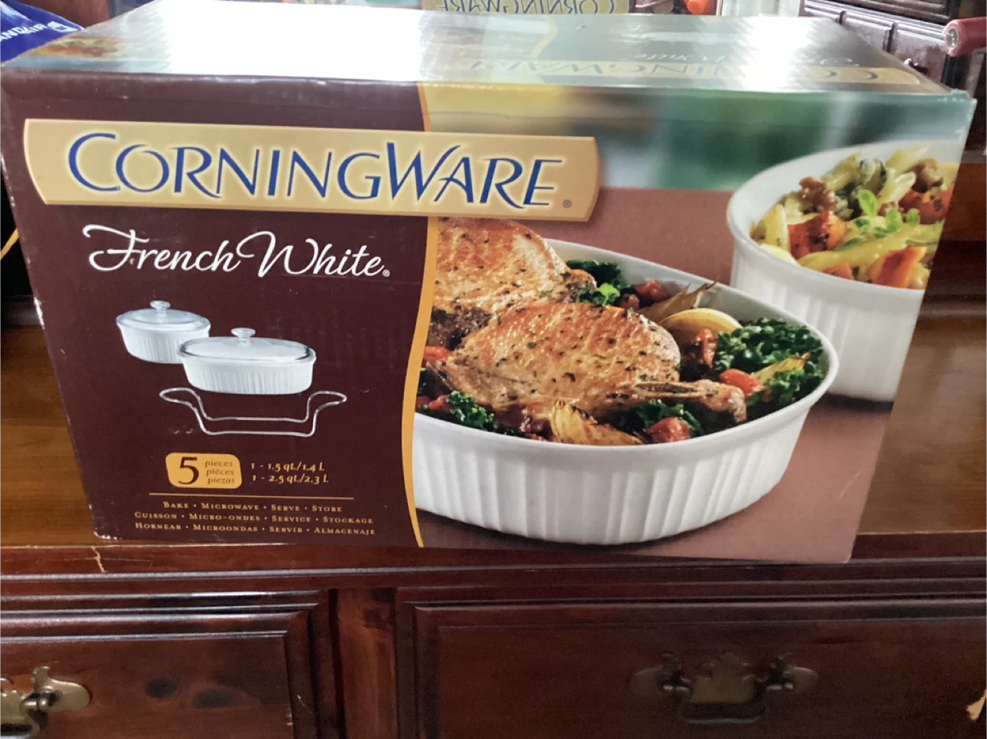 10Selling a CorningWare French White 5-piece set! This set is perfect for baking, microwaving, serving, and storing. It includes pieces with capacities of 1.5 qt/1.4 L and 2.5 qt/2.3 L. Great for any kitchen!
