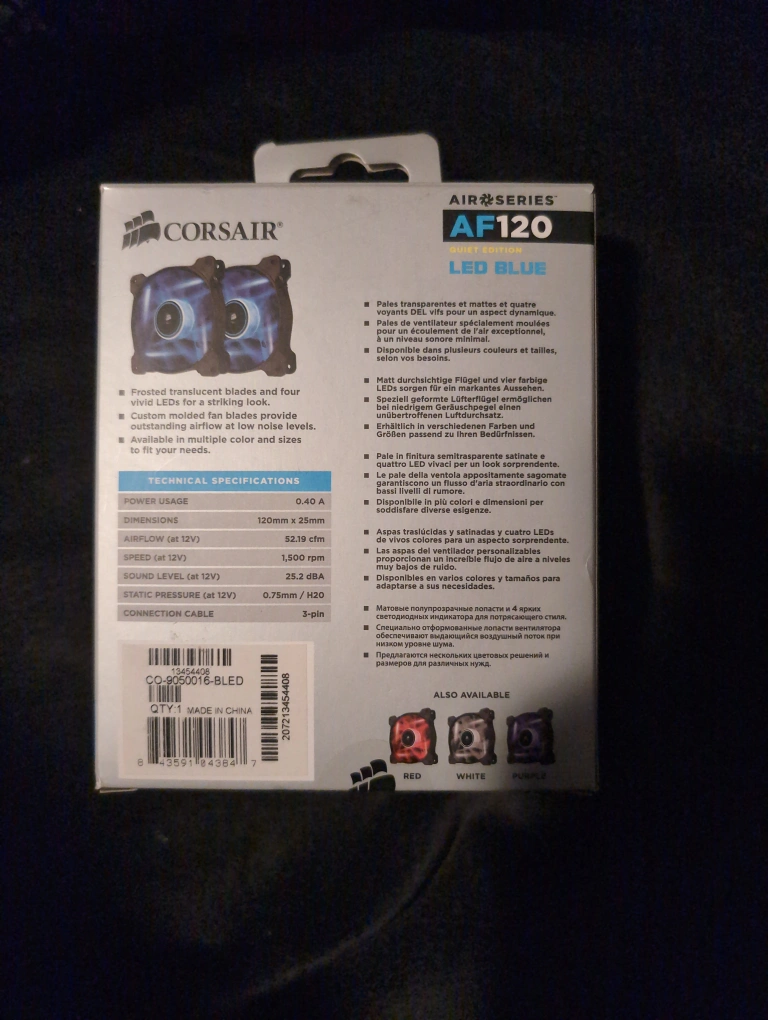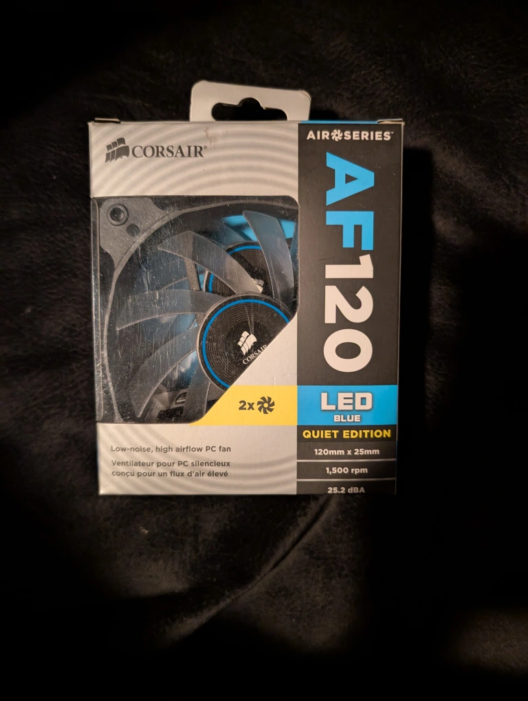 60Looking to keep your PC cool and quiet? I'm selling a Corsair AF120 LED Blue Quiet Edition PC fan. It's a 120mm x 25mm fan with a low-noise design for efficient cooling. The fan features frosted translucent blades and four vivid LEDs. It operates at 1,500 rpm with a sound level of 25.2 dBA. Box included! Never used.