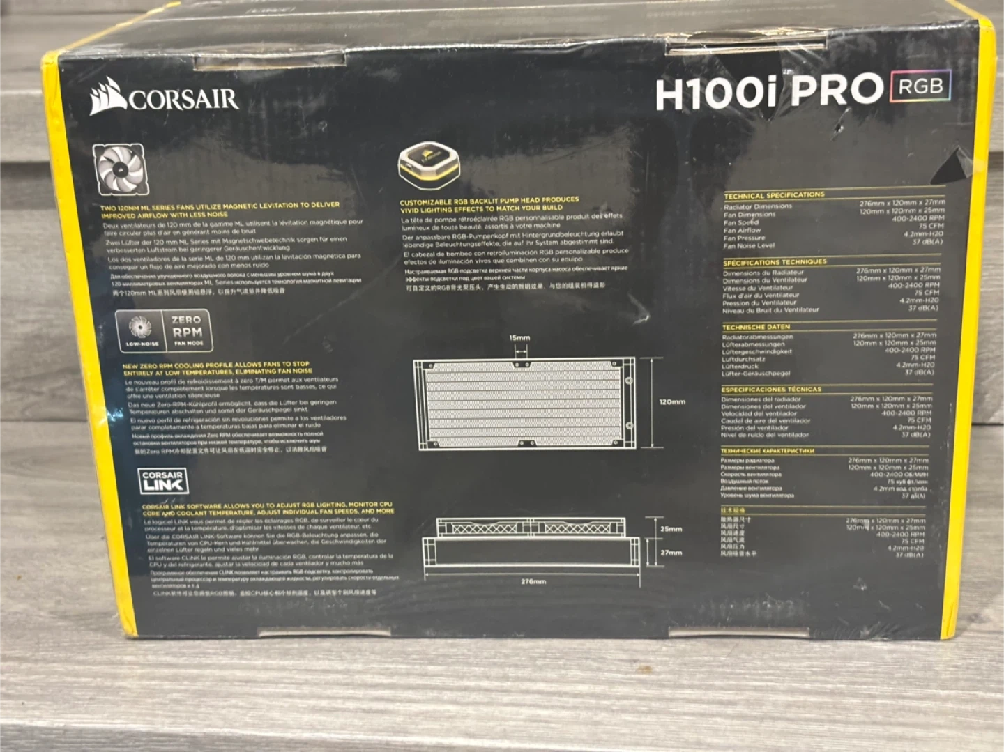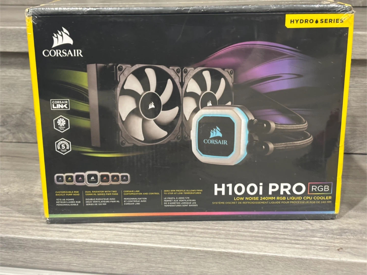 9Selling a brand new Corsair H100i PRO RGB liquid CPU cooler, still in its original box! This low-noise cooler features a 240mm radiator for efficient cooling. It comes with customizable RGB backlit pump head and dual radiator with two 120mm ML series PWM fans. Corsair Link customization and control is included. Zero RPM profile allows fans to stop at low temperatures. Great for keeping your CPU cool and looking good!