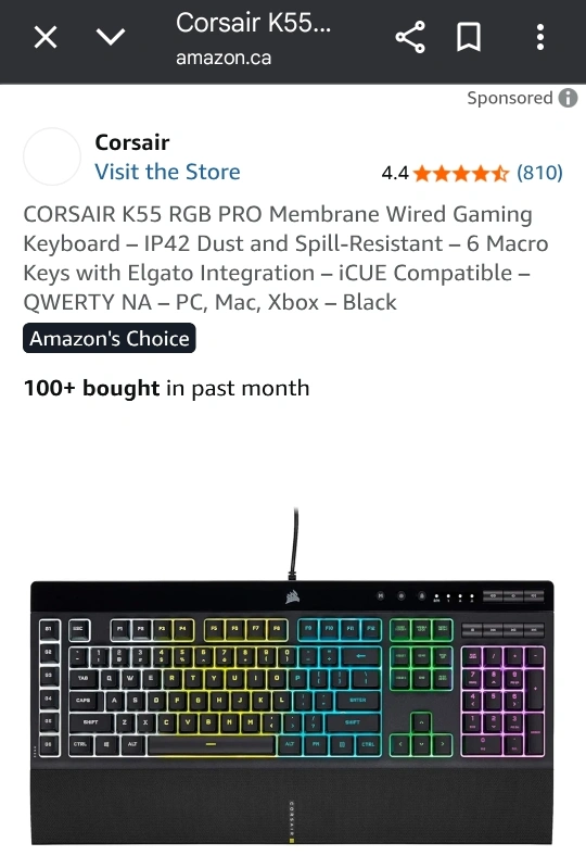Selling a Corsair K55 RGB PRO gaming keyboard. It's in great condition and ready for a new home! This membrane wired gaming keyboard is IP42 dust and spill-resistant, and it features 6 macro keys with Elgato integration. It's also iCUE compatible with QWERTY NA layout for PC, Mac, Xbox, and Black