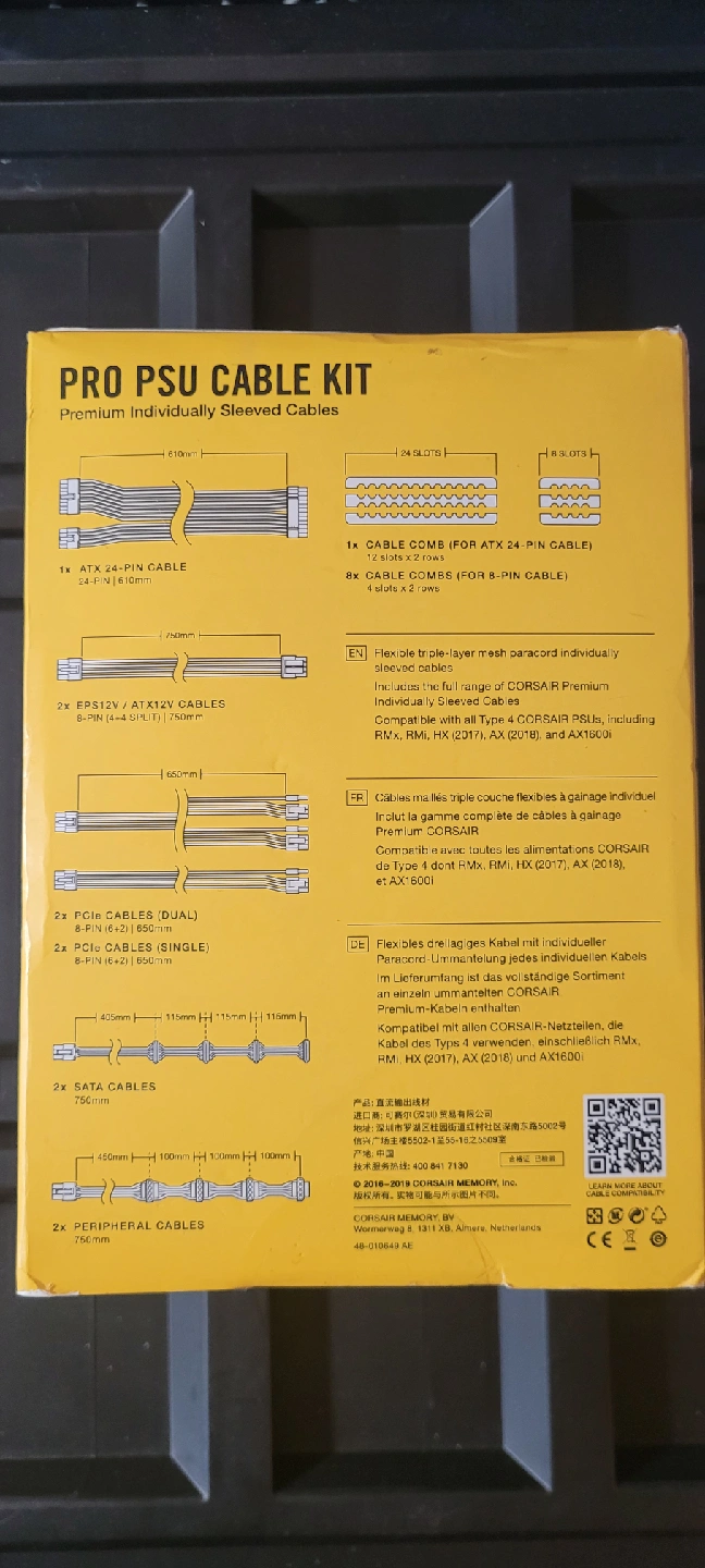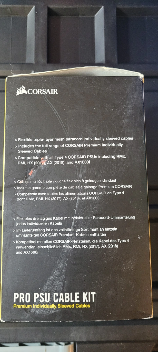 Selling a Corsair Pro PSU Cable Kit, it includes premium individually sleeved cables. - Flexible triple-layer mesh parcord individually sleeved cables - Includes the full range of CORSAIR Premium Individually Sleeved Cables - Compatible with all Type 4 CORSAIR PSUs including RMx, RMi, HX (2017), AX (2018), and AX1600i Box is included! pick up kfc tomken and dundas