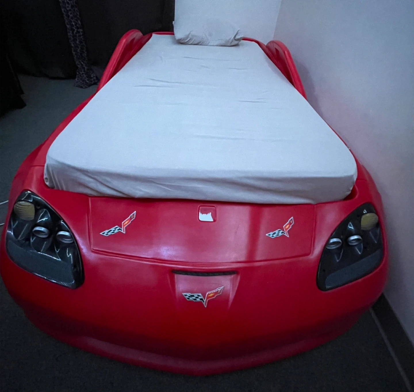Rev up your little one's room with this fun Corvette car toddler bed! It's a vibrant red and shaped just like a Corvette sports car. Perfect for transitioning from a crib to a big kid bed, this bed will make bedtime an adventure