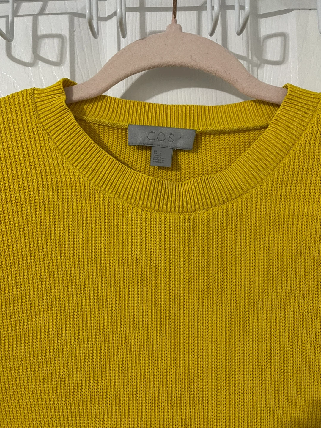 10Cozy up in this vibrant yellow knit sweater from COS! It's a size medium and in great condition. Perfect for adding a pop of colour to your wardrobe and staying warm on chilly days