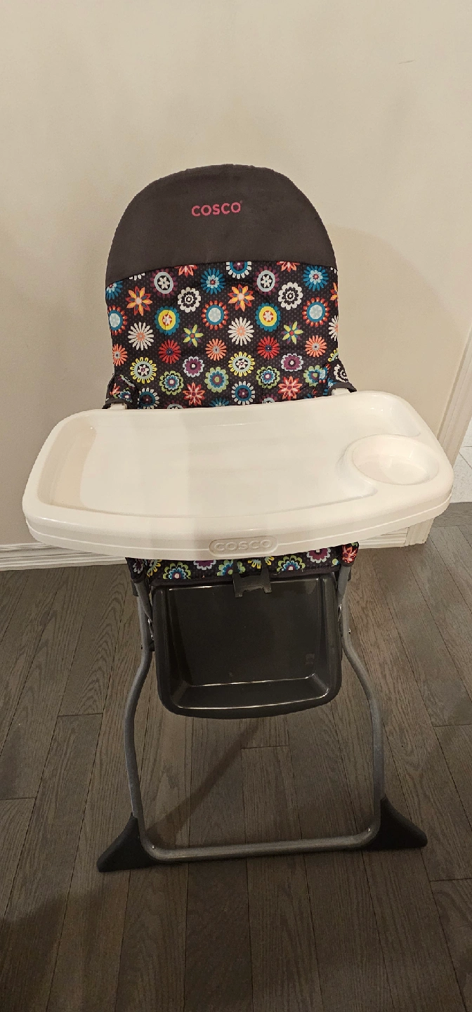 Selling a Cosco high chair with a fun floral pattern! It's in great shape and ready for a new home. The tray is included, making mealtime a breeze for your little one