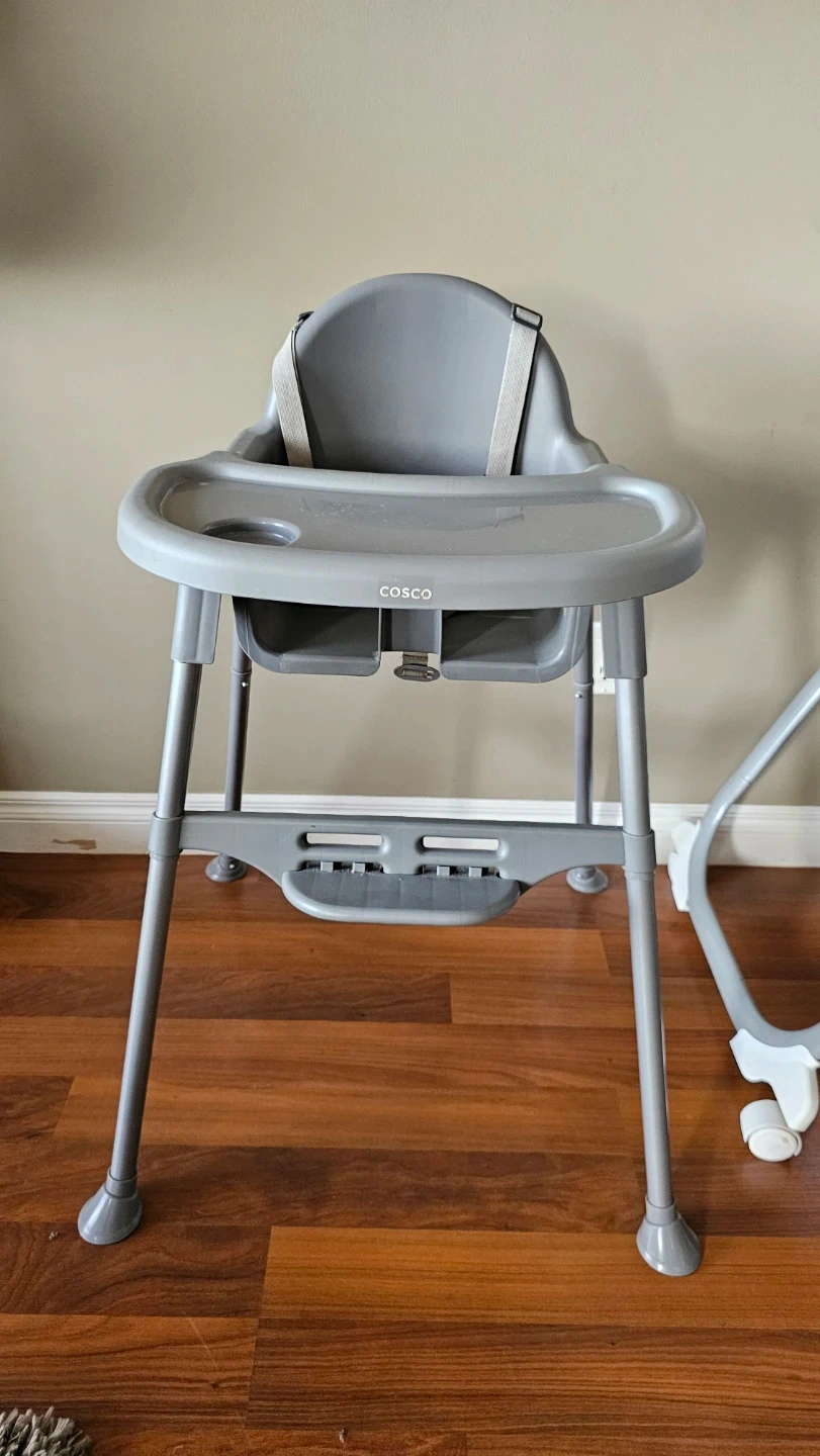 5Selling a Cosco high chair in great condition! It's a practical and simple design, perfect for feeding time. The chair is grey and easy to clean. It also folds for easy storage when not in use.