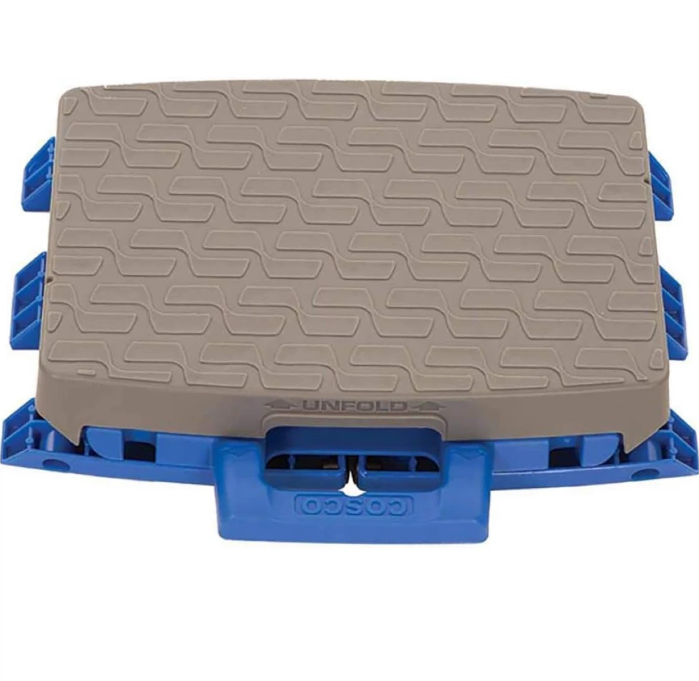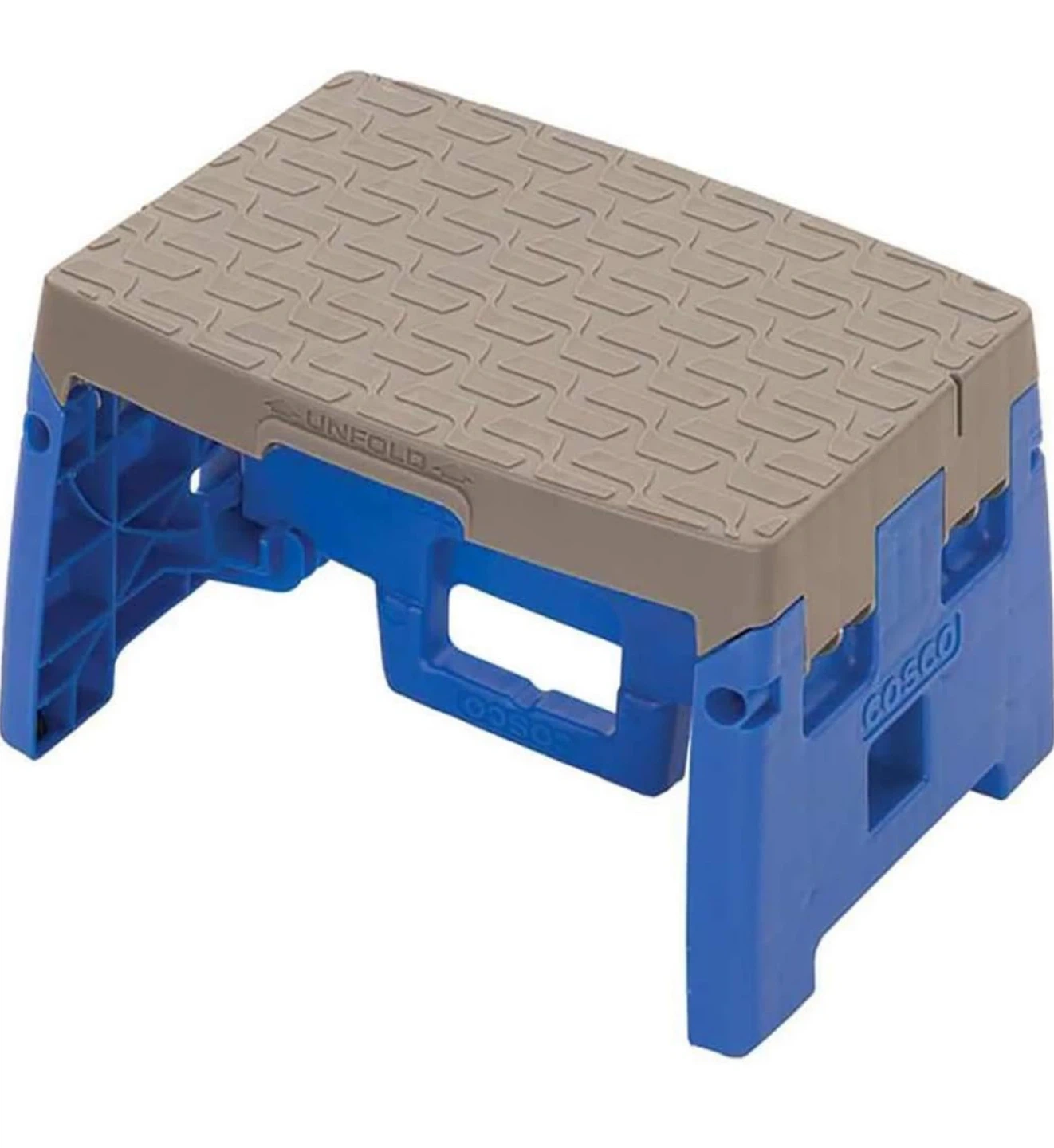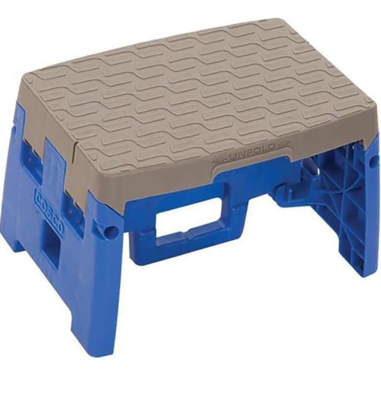 10This is a Cosco two-step folding step stool in blue and grey. It's super handy for reaching those high shelves or giving you a little boost! Folds up easily for convenient storage