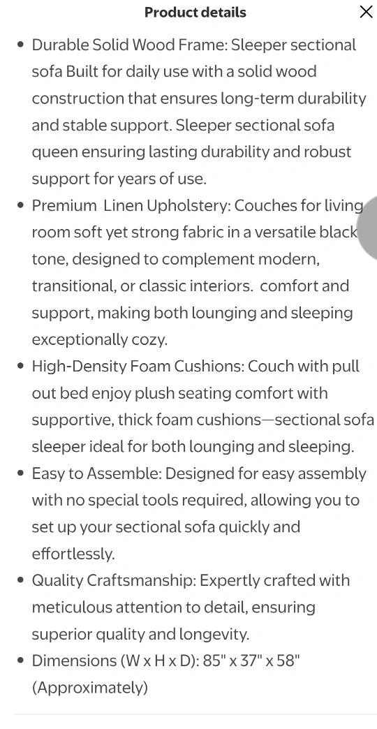 Selling a gently used Cosmic Homes Trenton Sectional Sofa Bed with Storage. It's a durable sleeper sectional sofa built for daily use with a solid wood frame, ensuring long-term durability and stable support. It features premium linen upholstery, making it soft yet strong. The high-density foam cushions provide great seating comfort. Easy to assemble. Dimensions are approximately 85" x 37" x 58".