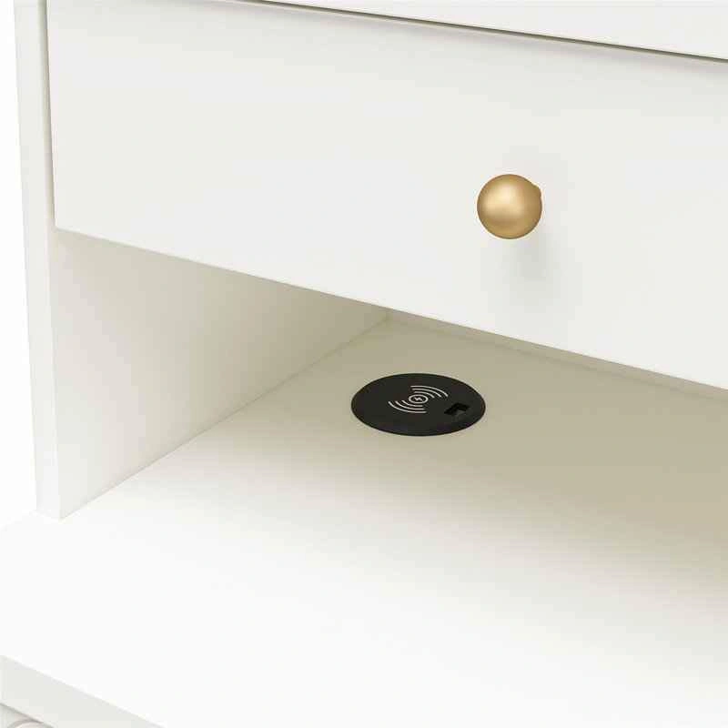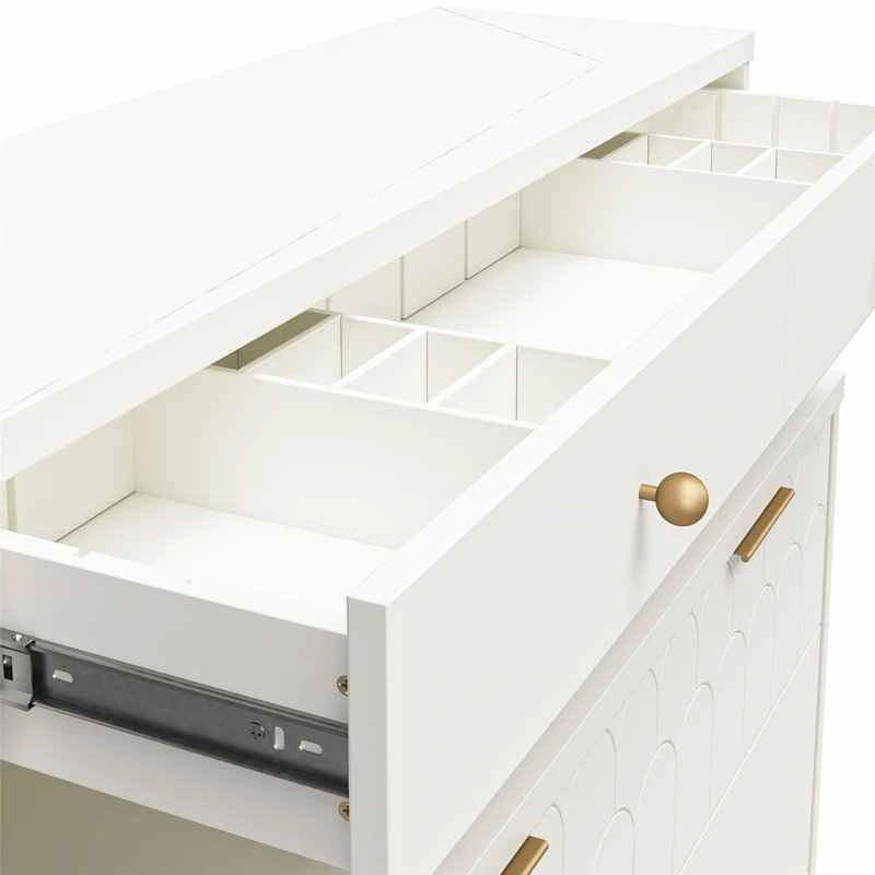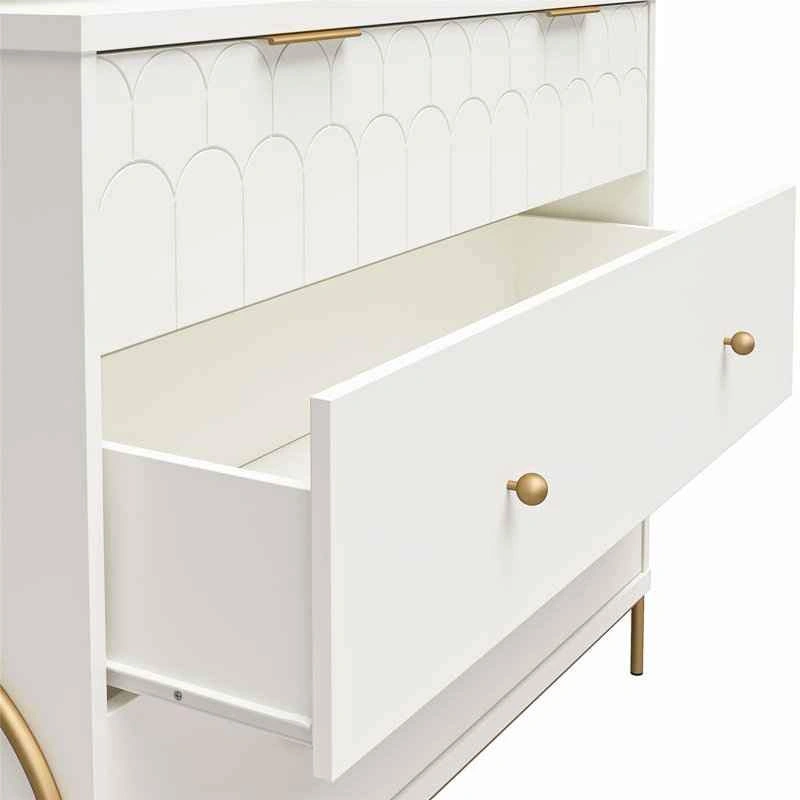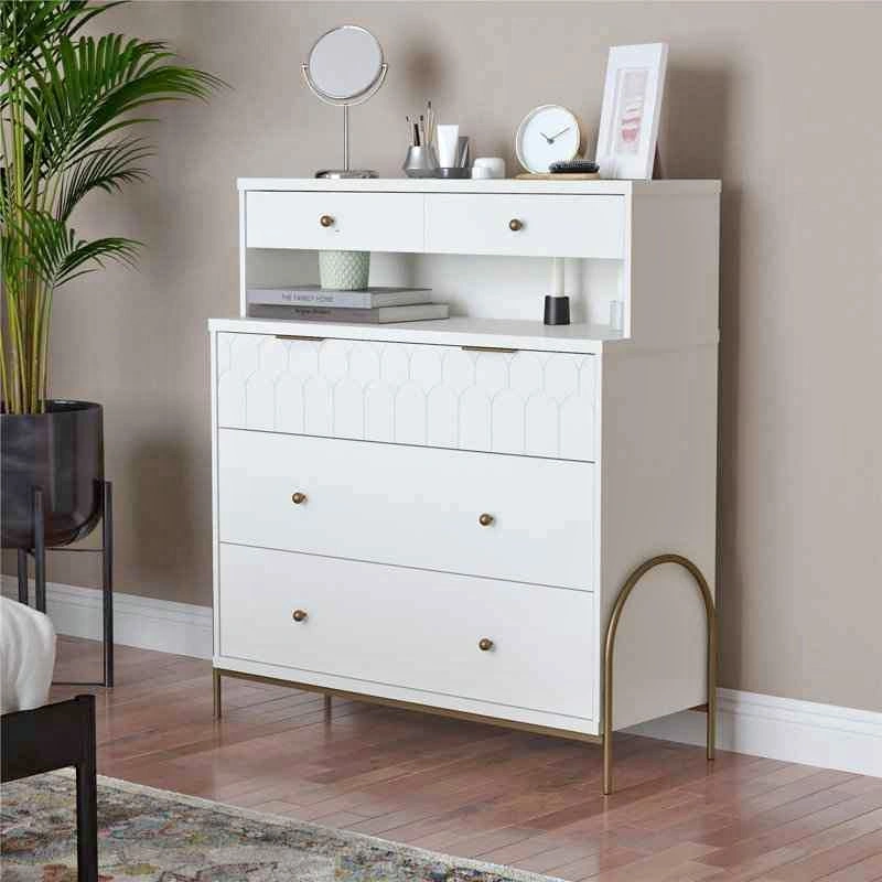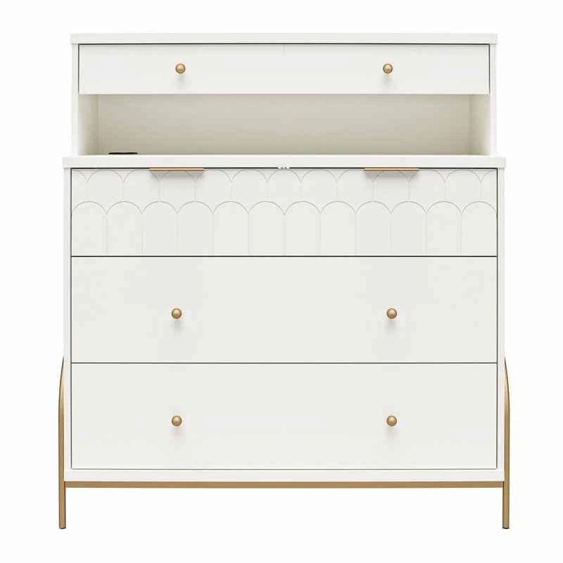 79Brand New dresser. It comes unassembled in original box with all manufacturer parts and hardware for easy assembly. Retails at Wayfair for $622 ($550 + tax). Save your money. Pickup from south London. I can deliver in London for an extra fee. Product details: Say hello to the fun and very flirty Anastasia Collection from CosmoLiving by Cosmopolitan. Because yes, you need this in your life! Bursting with personality, this refreshing collection features neutral finishes with playful scalloped details, accented by brassy hardware and curvaceous rounded metal legs. The 4 Drawer Dresser Hutch is the perfect bedroom piece providing divided compartments in the top drawer for all that glitters, and a seriously convenient wireless charger beneath the hutch. Three larger drawers give ample space for organizing your favourite fits. Did we mention, the ultra-durable MDF and powder-coated steel construction of this dresser can stand the test of time without depleting your bank account? Treat yourself to this and many more on-point pieces from CosmoLiving by Cosmopolitan for a fiercely coordinated look. (each sold separately). Features: The Dresser ships flat in one box and require two adults to assemble. Assembled measurements: 41.8" W x 15.8" D x 46" H; Jewellery drawer: 39" W x 8.9" D x 4.7"H; Lower 3 Drawers: 39" W x 13.2" D x 5.83" H; Hutch: 40.7" W x 12.2" D x 11.7" H. Max Weight Capacities: Hutch top: 20 lbs. Dresser top: 30 lbs. Jewellery drawer: 15 lbs. Lower 3 Drawers: 35 lbs. each; Assembled unit weight: 114.8 lbs.